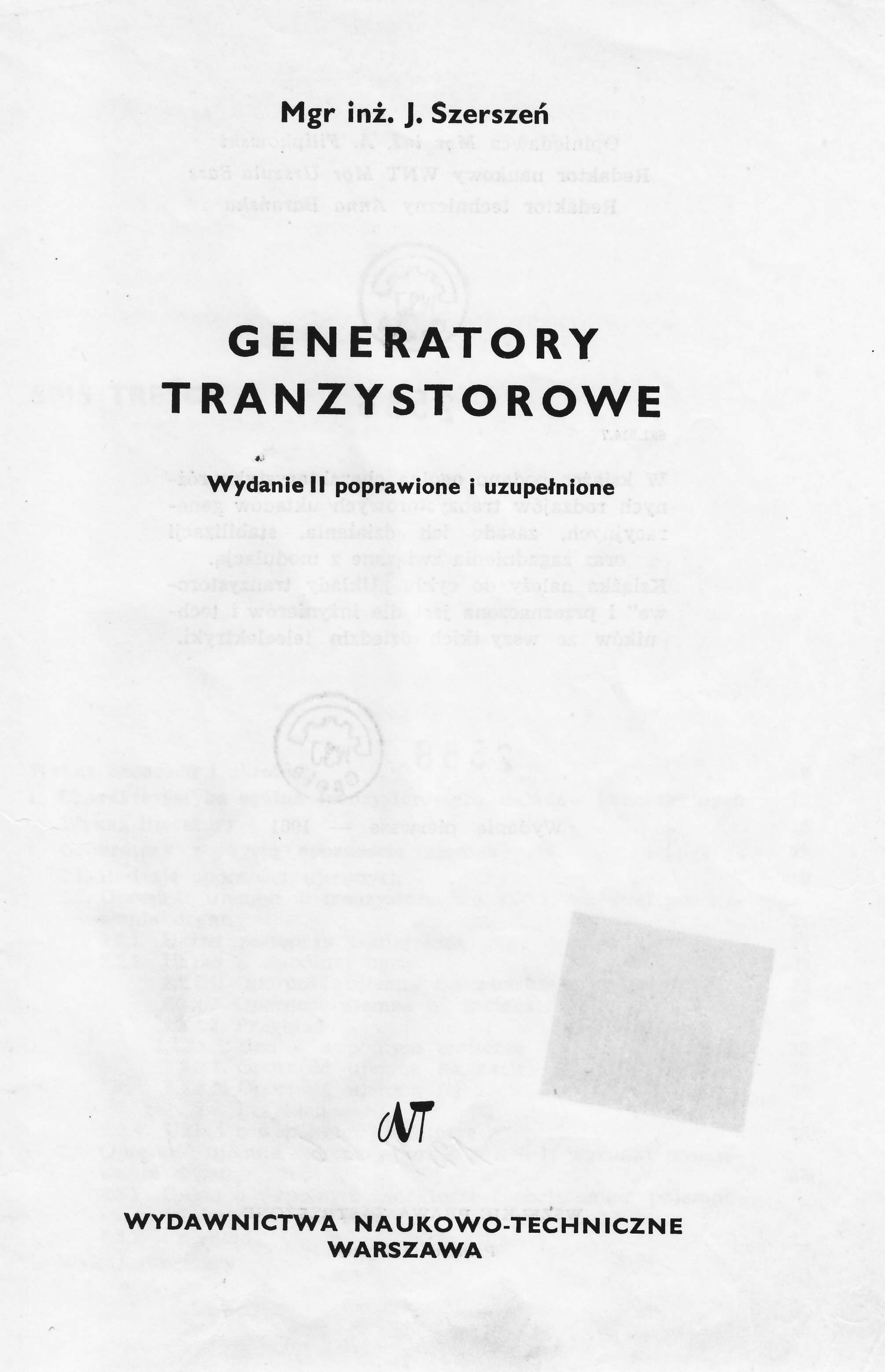 Generatory tranzystorowe / J. Szerszeń. - Wyd. 2 popr. i uzup. - Warszawa : Państwowe Wydawnictwa Techniczne, 1965. - 177, [2] s. : il. ; 21 cm.