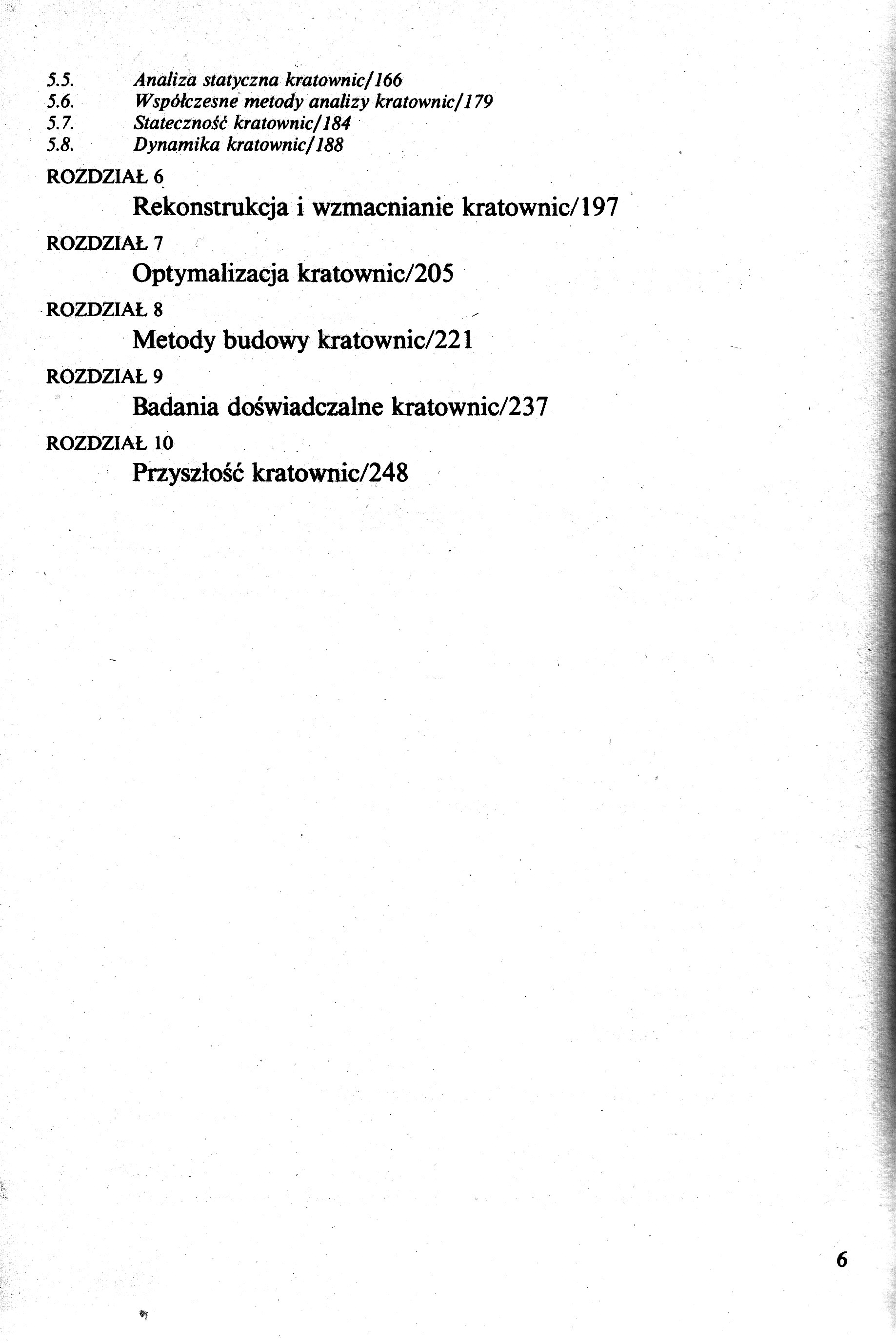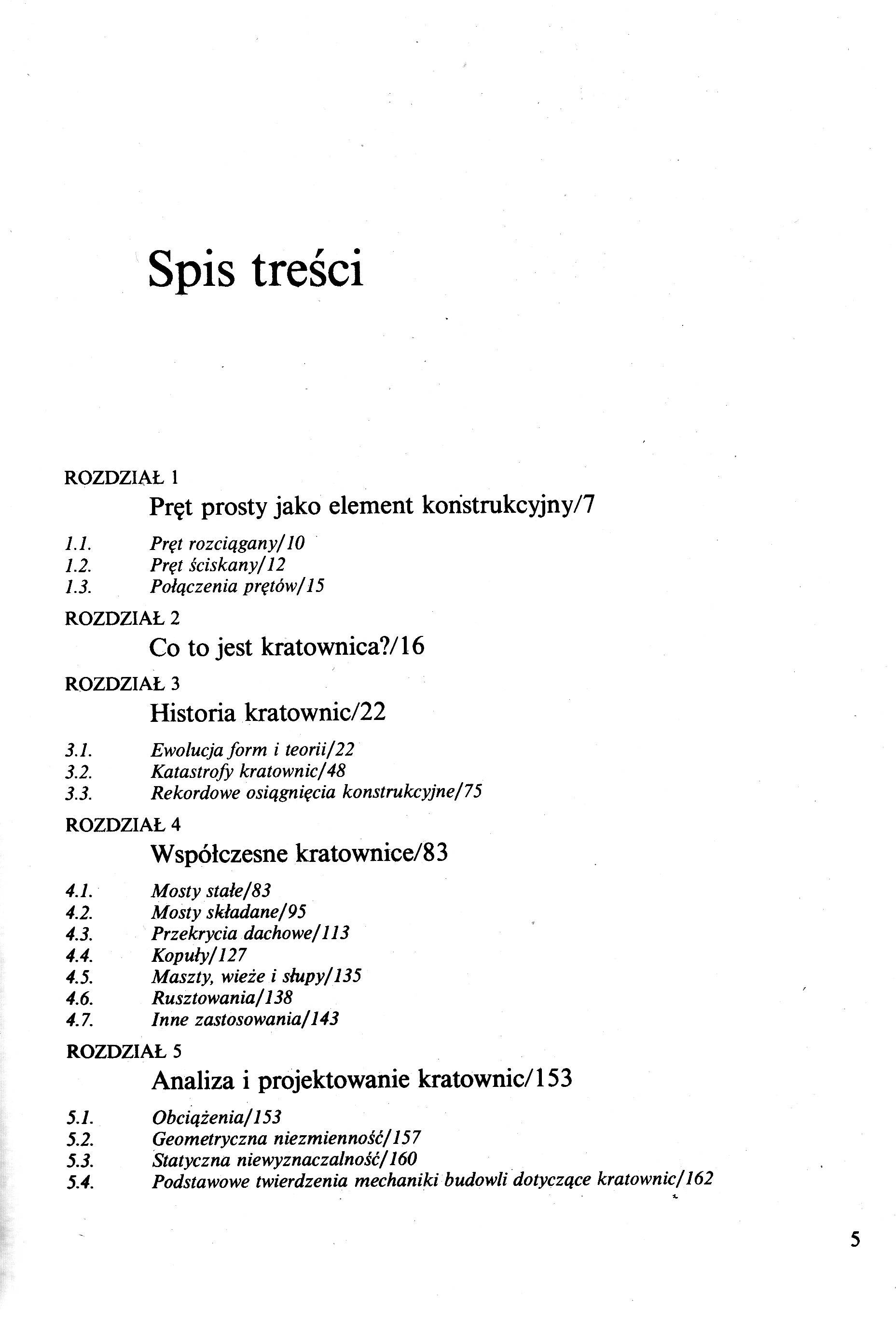 Pręt prosty jako element konstrukcyjny Pręt rozciągany Pręt ściskany Połączenia prętów Co to jest kratownica? Historia kratownic Ewolucja form i teorii Katastrofy kratownic Rekordowe osiągnięcia konstrukcyjne Współczesne kratownice Mosty stałe Mosty składane Przekrycia dachowe Kopuły Maszty, wieże i słupy Rusztowania Inne zastosowania Analiza i projektowanie kratownic Obciążenia Geometryczna niezmienność Statyczna niewyznaczalność Podstawowe twierdzenia mechaniki budowli dotyczące kratownic Analiza statyczna kratownic Współczesne metody analizy kratownic Stateczność kratownic Dynamika kratownic Rekonstrukcja i wzmacnianie kratownic Optymalizacja kratownic Metody budowy katownie Badania doświadczalne kratownic Przyszłość kratownic