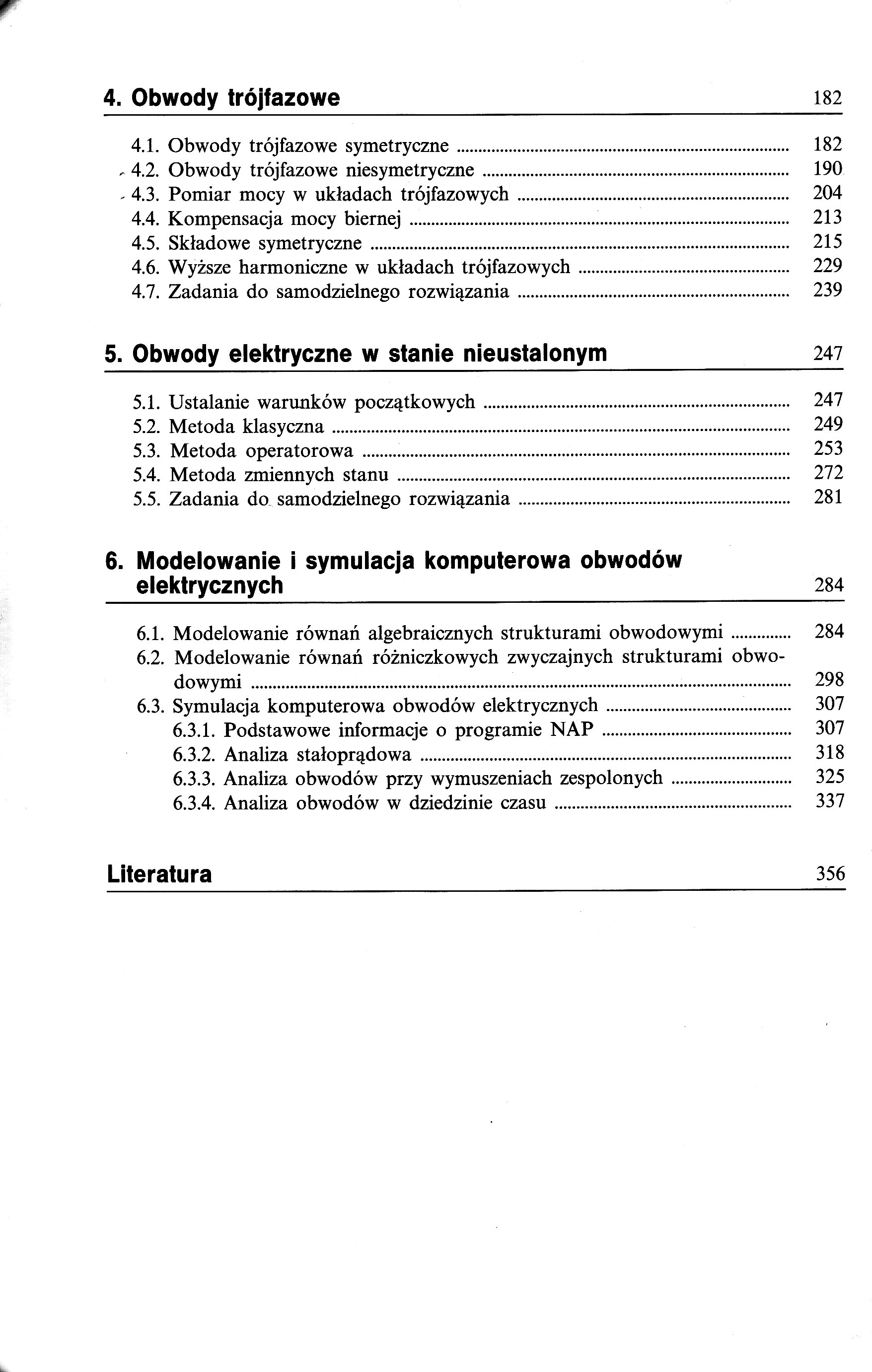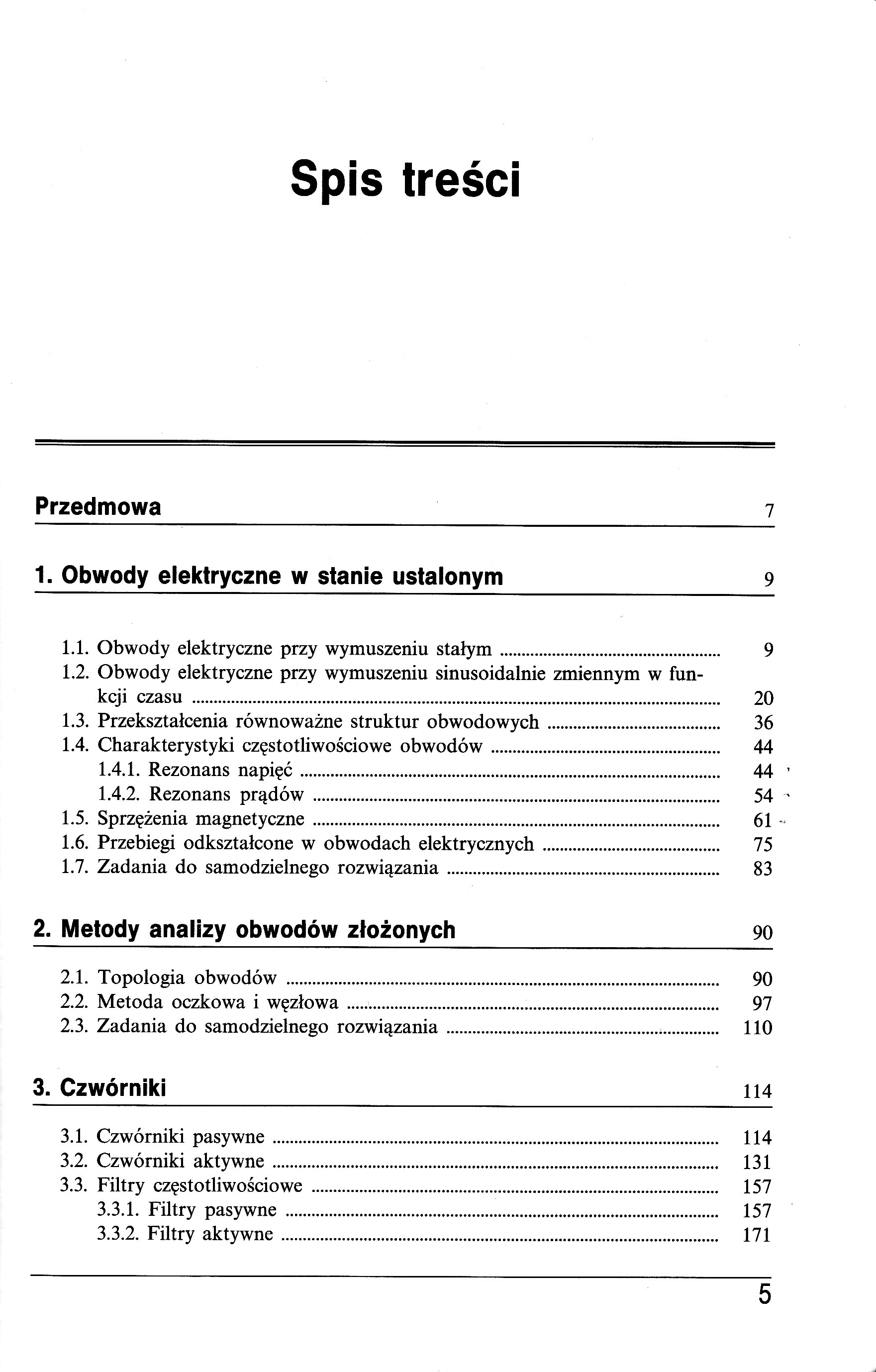 1. Obwody elektryczne w stanie ustalonym 9 1.1. Obwody elektryczne przy wymuszeniu stałym 9 1.2. Obwody elektryczne przy wymuszeniu sinusoidalnie zmiennym w funkcji czasu 20 1.3. Przekształcenia równoważne struktur obwodowych 36 1.4. Charakterystyki częstotliwościowe obwodów 44 1.4.1. Rezonans napięć 44 1.4.2. Rezonans prądów 54 1.5. Sprzężenia magnetyczne 61 1.6. Przebiegi odkształcone w obwodach elektrycznych 75 1.7. Zadania do samodzielnego rozwiązania 83 2. Metody analizy obwodów złożonych 90 2.1. Topologia obwodów 90 2.2. Metoda oczkowa i węzłowa 97 2.3. Zadania do samodzielnego rozwiązania 110 3. Czwórniki 114 3.1. Czwórniki pasywne 114 3.2. Czwórniki aktywne 131 3.3. Filtry częstotliwościowe 157 3.3.1. Filtry pasywne 157 3.3.2. Filtry aktywne 171 4. Obwody trójfazowe 182 4.1. Obwody trójfazowe symetryczne 182 4.2. Obwody trójfazowe niesymetryczne 190 4.3. Pomiar mocy w układach trójfazowych 204 4.4. Kompensacja mocy biernej 213 4.5. Składowe symetryczne 215 4.6. Wyższe harmoniczne w układach trójfazowych 229 4.7. Zadania do samodzielnego rozwiązania 239 5. Obwody elektryczne w stanie nieustalonym 247 5.1. Ustalanie warunków początkowych 247 5.2. Metoda klasyczna 249 5.3. Metoda operatorowa 253 5.4. Metoda zmiennych stanu 272 5.5. Zadania do samodzielnego rozwiązania 281 6. Modelowanie i symulacja komputerowa obwodów elektrycznych 284 6.1. Modelowanie równań algebraicznych strukturami obwodowymi 284 6.2. Modelowanie równań różniczkowych zwyczajnych strukturami obwodowymi 298 6.3. Symulacja komputerowa obwodów elektrycznych 307 6.3.1. Podstawowe informacje o programie NAP 307 6.3.2. Analiza stałoprądowa 318 6.3.3. Analiza obwodów przy wymuszeniach zespolonych 325 6.3.4. Analiza obwodów w dziedzinie czasu 337