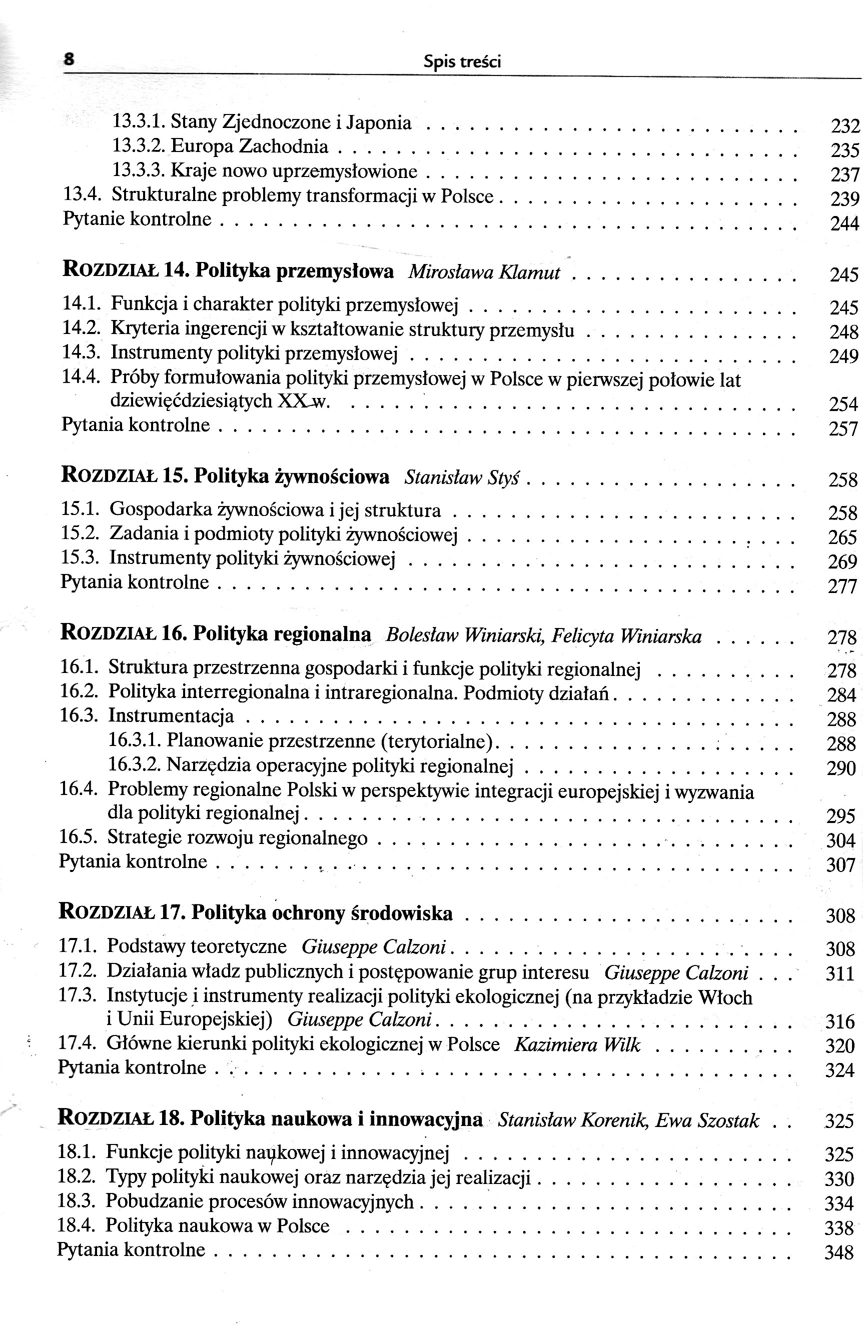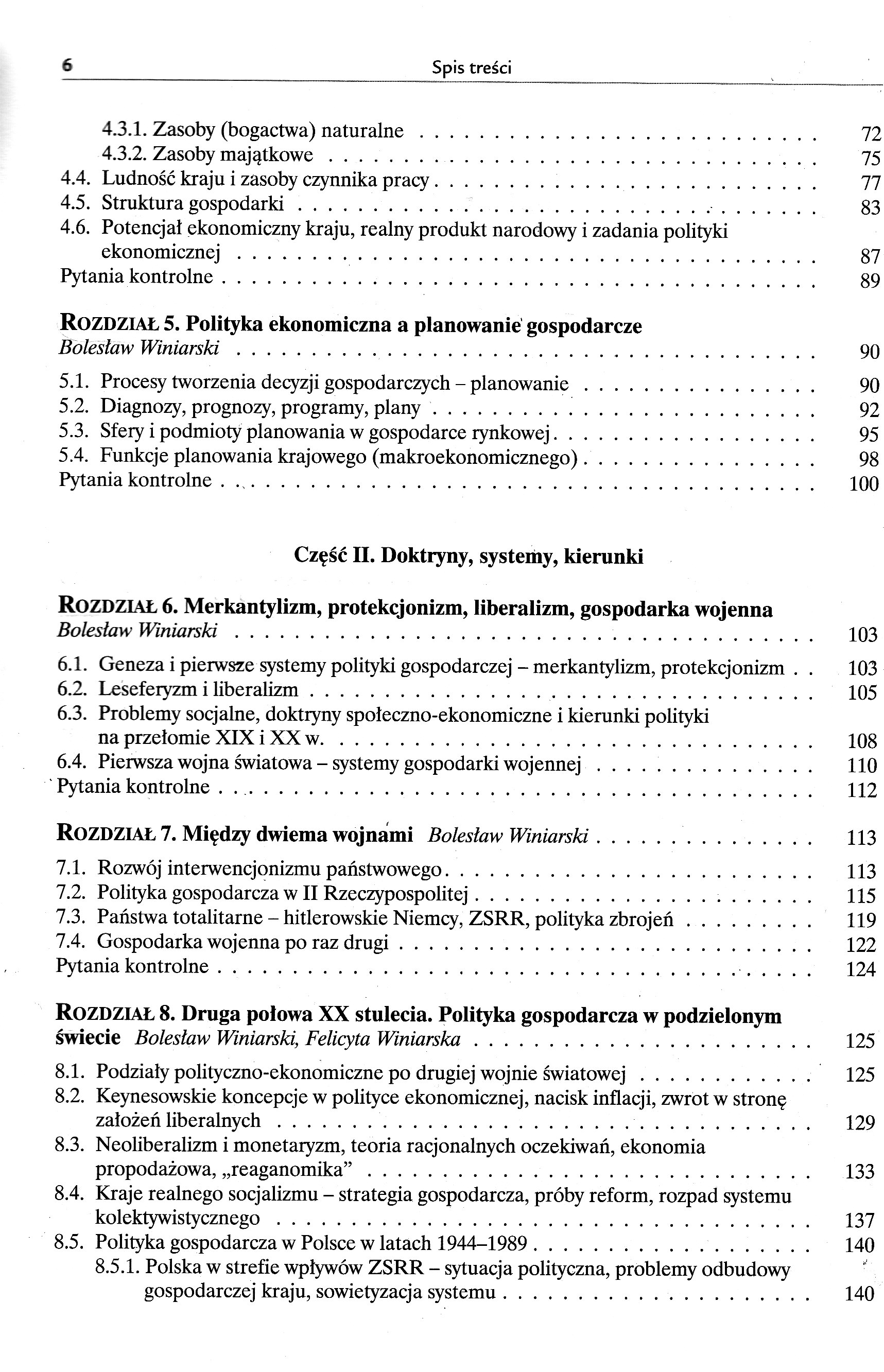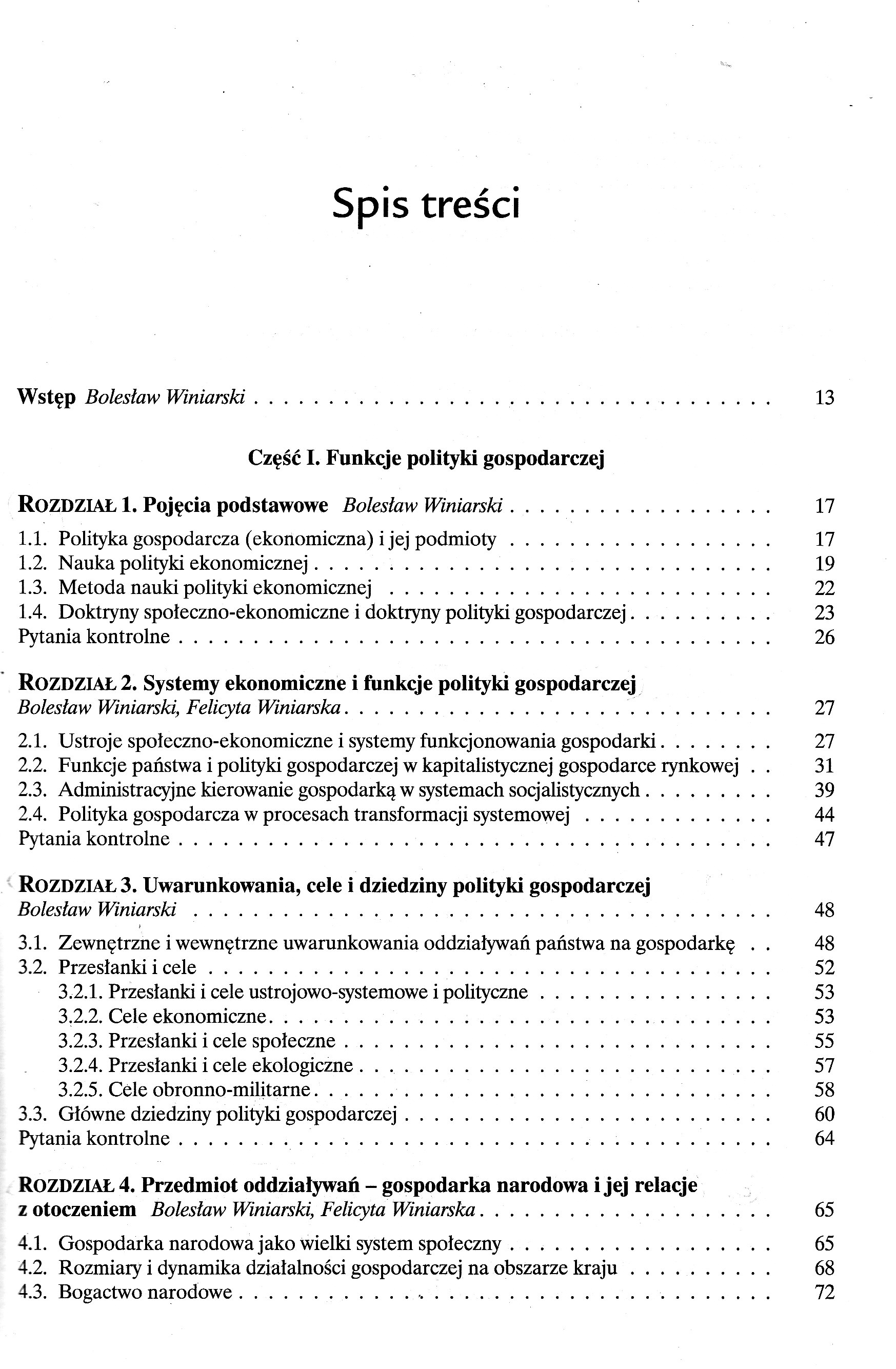 Część I. Funkcje polityki gospodarczej 1.1.Polityka gospodarcza (ekonomiczna) i jej podmioty 1.2.Nauka polityki ekonomicznej 1.3.Metoda nauki polityki ekonomicznej 1.4.Doktryny społeczno-ekonomiczne i doktryny polityki gospodarczej ROZDZIAŁ 2. Systemy ekonomiczne i funkcje polityki gospodarczej Bolesław Winiarski, Felicyta Winiarska 2.1.Ustroje społeczno-ekonomiczne i systemy funkcjonowania gospodarki 2.2.Funkcje państwa i polityki gospodarczej w kapitalistycznej gospodarce rynkowej 2.3.Administracyjne kierowanie gospodarką w systemach socjalistycznych 2.4.Polityka gospodarcza w procesach transformacji systemowej ROZDZIAŁ 3. Uwarunkowania, cele i dziedziny polityki gospodarczej Bolesław Winiarski 3.1.Zewnętrzne i wewnętrzne uwarunkowania oddziaływań państwa na gospodarkę 3.2.Przesłanki i cele 3.2.1.Przesłanki i cele ustrojowo-systemowe i polityczne 3.2.2.Cele ekonomiczne 3.2.3.Przesłanki i cele społeczne 3.2.4.Przesłanki i cele ekologiczne 3.2.5.Cele obronno-militarne 3.3.Główne dziedziny polityki gospodarczej ROZDZIAŁ 4. Przedmiot oddziaływań - gospodarka narodowa i jej relacje z otoczeniem Bolesław Winiarski, Felicyta Winiarska 4.1.Gospodarka narodowa jako wielki system społeczny 4.2.Rozmiary i dynamika działalności gospodarczej na obszarze kraju 4.3.Bogactwo narodowe 4.3.1.Zasoby (bogactwa) naturalne 4.3.2.Zasoby majątkowe 4.4.Ludność kraju i zasoby czynnika pracy 4.5.Struktura gospodarki 4.6.Potencjał ekonomiczny kraju, realny produkt narodowy i zadania polityki ekonomicznej ROZDZIAŁ 5. Polityka ekonomiczna a planowanie gospodarcze Bolesław Winiarski 5.1.Procesy tworzenia decyzji gospodarczych - planowanie 5.2.Diagnozy, prognozy, programy, plany 5.3.Sfery i podmioty planowania w gospodarce rynkowej 5.4.Funkcje planowania krajowego (makroekonomicznego) Część II. Doktryny, systemy, kierunki ROZDZIAŁ 6. Merkantylizm, protekcjonizm, liberalizm, gospodarka wojenna Bolesław Winiarski 6.1.Geneza i pierwsze systemy polityki gospodarczej - merkantylizm, protekcjonizm 6.2.Leseferyzm i liberalizm 6.3.Problemy socjalne, doktryny społeczno-ekonomiczne i kierunki polityki na przełomie XIX i XX w. 6.4.Pierwsza wojna światowa - systemy gospodarki wojennej ROZDZIAŁ 7. Między dwiema wojnami Bolesław Winiarski 7.1.Rozwój interwencjonizmu państwowego 7.2.Polityka gospodarcza w II Rzeczypospolitej 7.3.Państwa totalitarne - hitlerowskie Niemcy, ZSRR, polityka zbrojeń 7.4.Gospodarka wojenna po raz drugi ROZDZIAŁ 8. Druga polowa XX stulecia. Polityka gospodarcza w podzielonym świecie Bolesław Winiarski, Felicyta Winiarska 8.1.Podziały polityczno-ekonomiczne po drugiej wojnie światowej 8.2.Keynesowskie koncepcje w polityce ekonomicznej, nacisk inflacji, zwrot w stronę założeń liberalnych 8.3.Neoliberalizm i monetaryzm, teoria racjonalnych oczekiwań, ekonomia propodażowa, „reaganomika" 8.4.Kraje realnego socjalizmu - strategia gospodarcza, próby reform, rozpad systemu kolektywistycznego 8.5.Polityka gospodarcza w Polsce w latach 1944-1989 8.5.1. Polska w strefie wpływów ZSRR - sytuacja polityczna, problemy odbudowy gospodarczej kraju, sowietyzacja systemu 8.5.2.Próby reformowania systemu; orientacje polityki 8.5.3.Od sierpniowego przełomu w 1980 r. do upadku systemu komunistycznego ROZDZIAŁ 9. Procesy transformacji - od realnego socjalizmu do gospodarki rynkowej 9.1.Transformacja systemowa w krajach postkomunistycznych Bolesław Winiarski, Felicyta Winiarska 9.2.Polityka przebudowy systemowej w Polsce - stabilizacja i liberalizacja Bolesław Winiarski, Felicyta Winiarska 9.3.Prywatyzacja polskiej gospodarki Ewa Pancer-Cybulska 9.3.1.Formy przekształceń własnościowych 9.3.2.Inwestycje zagraniczne 9.3.3.Akcjonariat pracowniczy, spółdzielczość, komunalizacja 9.3.4.Tempo i skala procesu prywatyzacji 9.4.Ocena procesów transformacji w Polsce Bolesław Winiarski, Felicyta Winiarska ROZDZIAŁ 10. Polityka gospodarcza w obliczu procesów globalizacji. Perspektywy na pierwsze dziesięciolecia XXI wieku Bolesław Winiarski 10.1.Procesy globalizacji. Asymetria rozkładu korzyści i zagrożeń 10.2.Sukcesy ideologii wolnej konkurencji i rosnące wątpliwości 10.3.„Przypływy" i „odpływy" interwencji państwa w gospodarkę 10.4.Prognozy na przyszłość. Mechanizm konkurencji plus regulacja państwowa i międzynarodowa? Część III. Polityka rozwoju gospodarczego ROZDZIAŁ 11. Poszukiwanie ścieżki trwałego wzrostu Mirosława Klamut 11.1.Wzrost i rozwój gospodarczy. Czynniki wzrostu 11.2.Modele wzrostu 11.3.Polityka prowzrostowa (prorozwojowa). Regulowanie zdolności akumulacyjnych gospodarki ROZDZIAŁ 12. Problemy strategii rozwoju 12.1.Typy strategii rozwoju Jan Borowiec 12.2.„Strategie dla Polski" Bolesław Winiarski ROZDZIAŁ 13. Polityka strukturalna Mirosława Klamut 13.1.Struktura gospodarcza i jej definicje 13.2.Rodzaje i kierunki polityki strukturalnej 13.3.Mechanizm przezwyciężania barier strukturalnych w gospodarce w latach osiemdziesiątych XX w. - doświadczenia niektórych krajów 13.3.1.Stany Zjednoczone i Japonia 13.3.2.Europa Zachodnia 13.3.3.Kraje nowo uprzemysłowione 13.4. Strukturalne problemy transformacji w Polsce ROZDZIAŁ 14. Polityka przemysłowa Mirosława Klamut 14.1.Funkcja i charakter polityki przemysłowej 14.2.Kryteria ingerencji w kształtowanie struktury przemysłu 14.3.Instrumenty polityki przemysłowej 14.4.Próby formułowania polityki przemysłowej w Polsce w pierwszej połowie lat dziewięćdziesiątych XX w. ROZDZIAŁ 15. Polityka żywnościowa Stanisław Styś 15.1.Gospodarka żywnościowa i jej struktura 15.2.Zadania i podmioty polityki żywnościowej 15.3.Instrumenty polityki żywnościowej ROZDZIAŁ 16. Polityka regionalna Bolesław Winiarski, Felicyta Winiarska 16.1.Struktura przestrzenna gospodarki i funkcje polityki regionalnej 16.2.Polityka interregionalna i intraregionalna. Podmioty działań 16.3.Instrumentacja 16.3.1.Planowanie przestrzenne (terytorialne) 16.3.2.Narzędzia operac