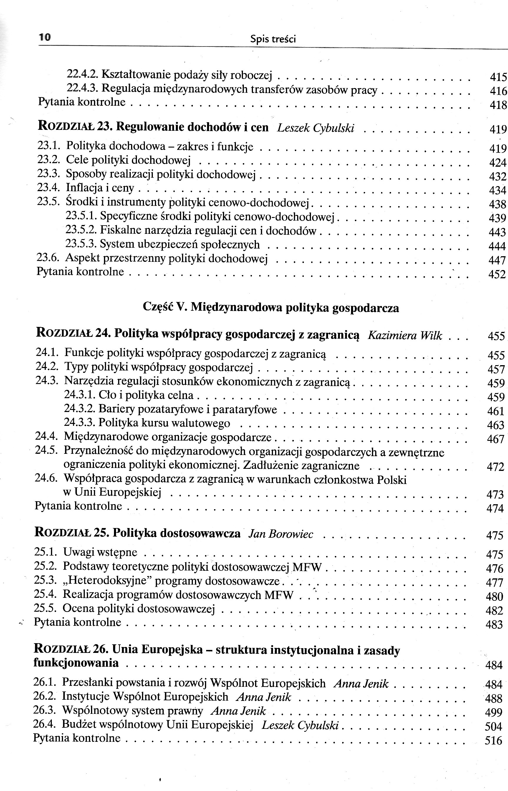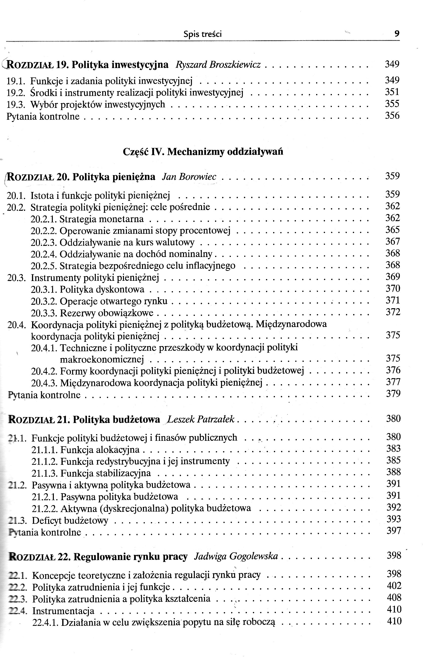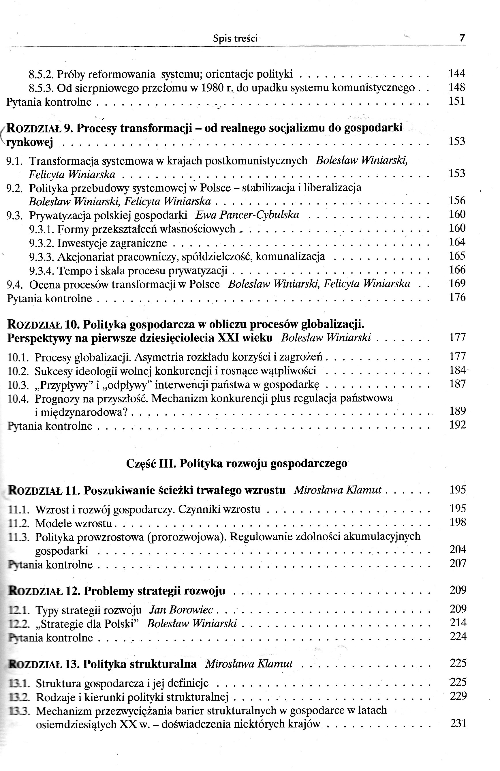 Część I. Funkcje polityki gospodarczej 1.1.Polityka gospodarcza (ekonomiczna) i jej podmioty 1.2.Nauka polityki ekonomicznej 1.3.Metoda nauki polityki ekonomicznej 1.4.Doktryny społeczno-ekonomiczne i doktryny polityki gospodarczej ROZDZIAŁ 2. Systemy ekonomiczne i funkcje polityki gospodarczej Bolesław Winiarski, Felicyta Winiarska 2.1.Ustroje społeczno-ekonomiczne i systemy funkcjonowania gospodarki 2.2.Funkcje państwa i polityki gospodarczej w kapitalistycznej gospodarce rynkowej 2.3.Administracyjne kierowanie gospodarką w systemach socjalistycznych 2.4.Polityka gospodarcza w procesach transformacji systemowej ROZDZIAŁ 3. Uwarunkowania, cele i dziedziny polityki gospodarczej Bolesław Winiarski 3.1.Zewnętrzne i wewnętrzne uwarunkowania oddziaływań państwa na gospodarkę 3.2.Przesłanki i cele 3.2.1.Przesłanki i cele ustrojowo-systemowe i polityczne 3.2.2.Cele ekonomiczne 3.2.3.Przesłanki i cele społeczne 3.2.4.Przesłanki i cele ekologiczne 3.2.5.Cele obronno-militarne 3.3.Główne dziedziny polityki gospodarczej ROZDZIAŁ 4. Przedmiot oddziaływań - gospodarka narodowa i jej relacje z otoczeniem Bolesław Winiarski, Felicyta Winiarska 4.1.Gospodarka narodowa jako wielki system społeczny 4.2.Rozmiary i dynamika działalności gospodarczej na obszarze kraju 4.3.Bogactwo narodowe 4.3.1.Zasoby (bogactwa) naturalne 4.3.2.Zasoby majątkowe 4.4.Ludność kraju i zasoby czynnika pracy 4.5.Struktura gospodarki 4.6.Potencjał ekonomiczny kraju, realny produkt narodowy i zadania polityki ekonomicznej ROZDZIAŁ 5. Polityka ekonomiczna a planowanie gospodarcze Bolesław Winiarski 5.1.Procesy tworzenia decyzji gospodarczych - planowanie 5.2.Diagnozy, prognozy, programy, plany 5.3.Sfery i podmioty planowania w gospodarce rynkowej 5.4.Funkcje planowania krajowego (makroekonomicznego) Część II. Doktryny, systemy, kierunki ROZDZIAŁ 6. Merkantylizm, protekcjonizm, liberalizm, gospodarka wojenna Bolesław Winiarski 6.1.Geneza i pierwsze systemy polityki gospodarczej - merkantylizm, protekcjonizm 6.2.Leseferyzm i liberalizm 6.3.Problemy socjalne, doktryny społeczno-ekonomiczne i kierunki polityki na przełomie XIX i XX w. 6.4.Pierwsza wojna światowa - systemy gospodarki wojennej ROZDZIAŁ 7. Między dwiema wojnami Bolesław Winiarski 7.1.Rozwój interwencjonizmu państwowego 7.2.Polityka gospodarcza w II Rzeczypospolitej 7.3.Państwa totalitarne - hitlerowskie Niemcy, ZSRR, polityka zbrojeń 7.4.Gospodarka wojenna po raz drugi ROZDZIAŁ 8. Druga polowa XX stulecia. Polityka gospodarcza w podzielonym świecie Bolesław Winiarski, Felicyta Winiarska 8.1.Podziały polityczno-ekonomiczne po drugiej wojnie światowej 8.2.Keynesowskie koncepcje w polityce ekonomicznej, nacisk inflacji, zwrot w stronę założeń liberalnych 8.3.Neoliberalizm i monetaryzm, teoria racjonalnych oczekiwań, ekonomia propodażowa, „reaganomika" 8.4.Kraje realnego socjalizmu - strategia gospodarcza, próby reform, rozpad systemu kolektywistycznego 8.5.Polityka gospodarcza w Polsce w latach 1944-1989 8.5.1. Polska w strefie wpływów ZSRR - sytuacja polityczna, problemy odbudowy gospodarczej kraju, sowietyzacja systemu 8.5.2.Próby reformowania systemu; orientacje polityki 8.5.3.Od sierpniowego przełomu w 1980 r. do upadku systemu komunistycznego ROZDZIAŁ 9. Procesy transformacji - od realnego socjalizmu do gospodarki rynkowej 9.1.Transformacja systemowa w krajach postkomunistycznych Bolesław Winiarski, Felicyta Winiarska 9.2.Polityka przebudowy systemowej w Polsce - stabilizacja i liberalizacja Bolesław Winiarski, Felicyta Winiarska 9.3.Prywatyzacja polskiej gospodarki Ewa Pancer-Cybulska 9.3.1.Formy przekształceń własnościowych 9.3.2.Inwestycje zagraniczne 9.3.3.Akcjonariat pracowniczy, spółdzielczość, komunalizacja 9.3.4.Tempo i skala procesu prywatyzacji 9.4.Ocena procesów transformacji w Polsce Bolesław Winiarski, Felicyta Winiarska ROZDZIAŁ 10. Polityka gospodarcza w obliczu procesów globalizacji. Perspektywy na pierwsze dziesięciolecia XXI wieku Bolesław Winiarski 10.1.Procesy globalizacji. Asymetria rozkładu korzyści i zagrożeń 10.2.Sukcesy ideologii wolnej konkurencji i rosnące wątpliwości 10.3.„Przypływy" i „odpływy" interwencji państwa w gospodarkę 10.4.Prognozy na przyszłość. Mechanizm konkurencji plus regulacja państwowa i międzynarodowa? Część III. Polityka rozwoju gospodarczego ROZDZIAŁ 11. Poszukiwanie ścieżki trwałego wzrostu Mirosława Klamut 11.1.Wzrost i rozwój gospodarczy. Czynniki wzrostu 11.2.Modele wzrostu 11.3.Polityka prowzrostowa (prorozwojowa). Regulowanie zdolności akumulacyjnych gospodarki ROZDZIAŁ 12. Problemy strategii rozwoju 12.1.Typy strategii rozwoju Jan Borowiec 12.2.„Strategie dla Polski" Bolesław Winiarski ROZDZIAŁ 13. Polityka strukturalna Mirosława Klamut 13.1.Struktura gospodarcza i jej definicje 13.2.Rodzaje i kierunki polityki strukturalnej 13.3.Mechanizm przezwyciężania barier strukturalnych w gospodarce w latach osiemdziesiątych XX w. - doświadczenia niektórych krajów 13.3.1.Stany Zjednoczone i Japonia 13.3.2.Europa Zachodnia 13.3.3.Kraje nowo uprzemysłowione 13.4. Strukturalne problemy transformacji w Polsce ROZDZIAŁ 14. Polityka przemysłowa Mirosława Klamut 14.1.Funkcja i charakter polityki przemysłowej 14.2.Kryteria ingerencji w kształtowanie struktury przemysłu 14.3.Instrumenty polityki przemysłowej 14.4.Próby formułowania polityki przemysłowej w Polsce w pierwszej połowie lat dziewięćdziesiątych XX w. ROZDZIAŁ 15. Polityka żywnościowa Stanisław Styś 15.1.Gospodarka żywnościowa i jej struktura 15.2.Zadania i podmioty polityki żywnościowej 15.3.Instrumenty polityki żywnościowej ROZDZIAŁ 16. Polityka regionalna Bolesław Winiarski, Felicyta Winiarska 16.1.Struktura przestrzenna gospodarki i funkcje polityki regionalnej 16.2.Polityka interregionalna i intraregionalna. Podmioty działań 16.3.Instrumentacja 16.3.1.Planowanie przestrzenne (terytorialne) 16.3.2.Narzędzia operac