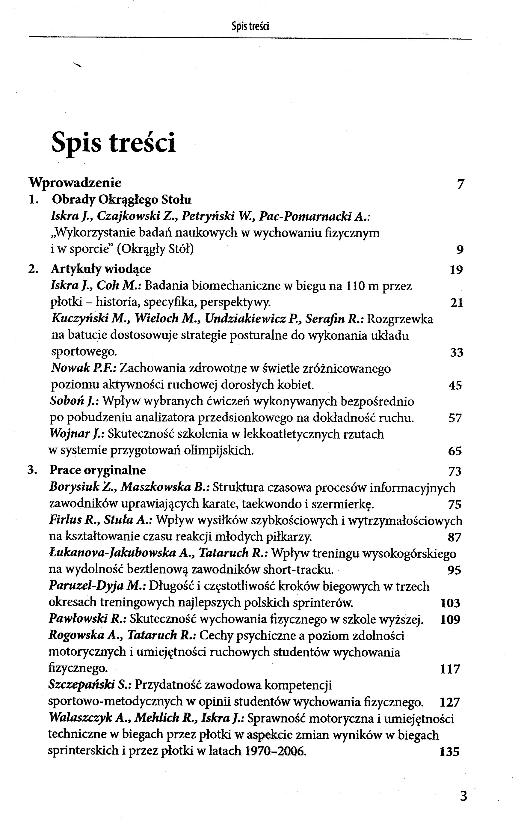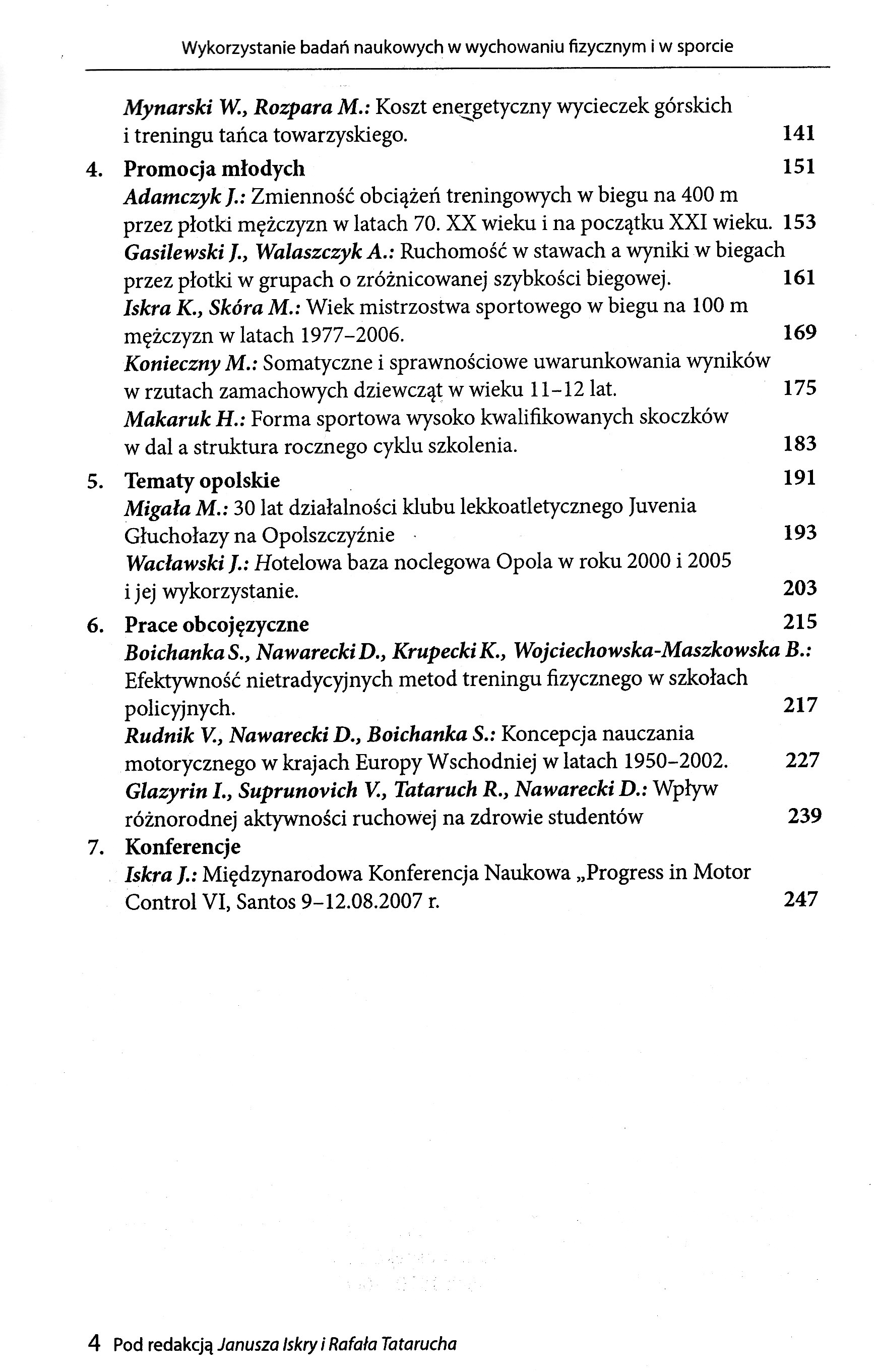 1.Iskra J., Czajkowski Z., Petryński W, Pac-Pomarnacki A. -Wykorzystanie badań naukowych w wychowaniu fizycznym i w sporcie'' (Okrąg Stół) Iskra 1., Coh M.: Badania biomechaniczne w biegu na 110 m przez płotki - historią specyfika, perspektywy. Kuczyński M., Wieloch M., Undziakiewicz P., Serafin R. Rozgrzewka na batucie dostosowuje strategie posturalne do wykonania układu sportowego. Nowak P.F. Zachowania zdrowotne w świetle zróżnicowanego poziomu aktywności ruchowej dorosłych kobiet. Sobań J. Wpływ wybranych ćwiczeń wykonywanych bezpośrednio po pobudzeniu analizatora przedsionkowego na dokładność ruchu. Wojnar J . Skuteczność szkolenia w lekkoatletycznych rzutach w systemie przygotowań olimpijskich. Borysiuk Z., Maszkowska B.; Struktura czasowa procesów informacyjnych zawodników uprawiających karate, taekwondo i szermierkę Firlus R., Stuła A.: Wpływ wysiłków szybkościowych i wytrzymałościowych na kształtowanie czasu reakcji młodych piłkarzy. Łukanova-Jakubowska A., Tataruch R. : Wpływ treningu wysokogórskiego na wydolność beztlenową zawodników short-tracku. Paruzel-Dyja M.: Długość i częstotliwość kroków biegowych w trzech okresach treningowych najlepszych polskich sprinterów. Pawłowski R.: Skuteczność wychowania fizycznego w szkole wyższej. Rogowska A., Tataruch R. Cechy psychiczne a poziom zdolności motorycznych i umiejętności ruchowych studentów wychowania fizycznego. Szczepański S. Przydatność zawodowa kompetencji sportowo-metodycznych w opinii studentów wychowania fizycznego- Walaszczyk A., Mehlich R., Iskra I.: Sprawność motoryczna i umiejętności techniczne w biegach przez płotki w aspekcie zmian wyników w biegach sprinterskich i przez płotki w latach 1970-2006. Mynarski W., Rozpara M.: Koszt energetyczny wycieczek górskich i treningu tańca towarzyskiego. Adamczyk J.; Zmienność obciążeń treningowych w biegu na 400 m przez płotki mężczyzn w latach 70. Xx wieku i na początku XXI wieku. Gasilewski J., Walaszczyk A.; Ruchomość w stawach a wyniki w biegach przez płotki w grupach o zróżnicowanej szybkości biegowej. Iskra K., Skóra M.: Wiek mistrzostwa sportowego w biegu na 100 m mężczyzn w latach 1977-2006. Konieczny M.: Somatyczne i sprawnościowe uwarunkowania wyników w rzutach zamachowych dziewcząt w wieku 11-12lat. Makaruk H.' Forma sportowa wysoko kwalifikowanych skoczków w dal a struktura rocznego cyklu szkolenia Migała M. : 30 lat działalności klubu lekkoatletycznego Juvenia Głuchołazy na Opolszczyźnie Wacławski J. Hotelowa baza noclegowa Opola w roku 2000 i 2005 i jej wykorzystanie. Boichanka S., Nawarecki D., Krupecki K., Wojciechowska-Maszkowska B. Efektywność nietradycyjnych metod treningu fizycznego w szkołach policyjnych. Rudnik V., Nawarecki D., Boichanka S.: Koncepcja nauczania motorycznego w krajach Europy Wschodniej w latach 1950-2002. Glazyrin 1., Suprunovich V., Tataruch R., Nawarecki D.: Wpływ różnorodnej aktywności ruchowej na zdrowie studentów Iskra J.: Międzynarodowa Konferencja Naukowa ,,Progress in Motor Control VI, Santos 9-12.08.2007 r.