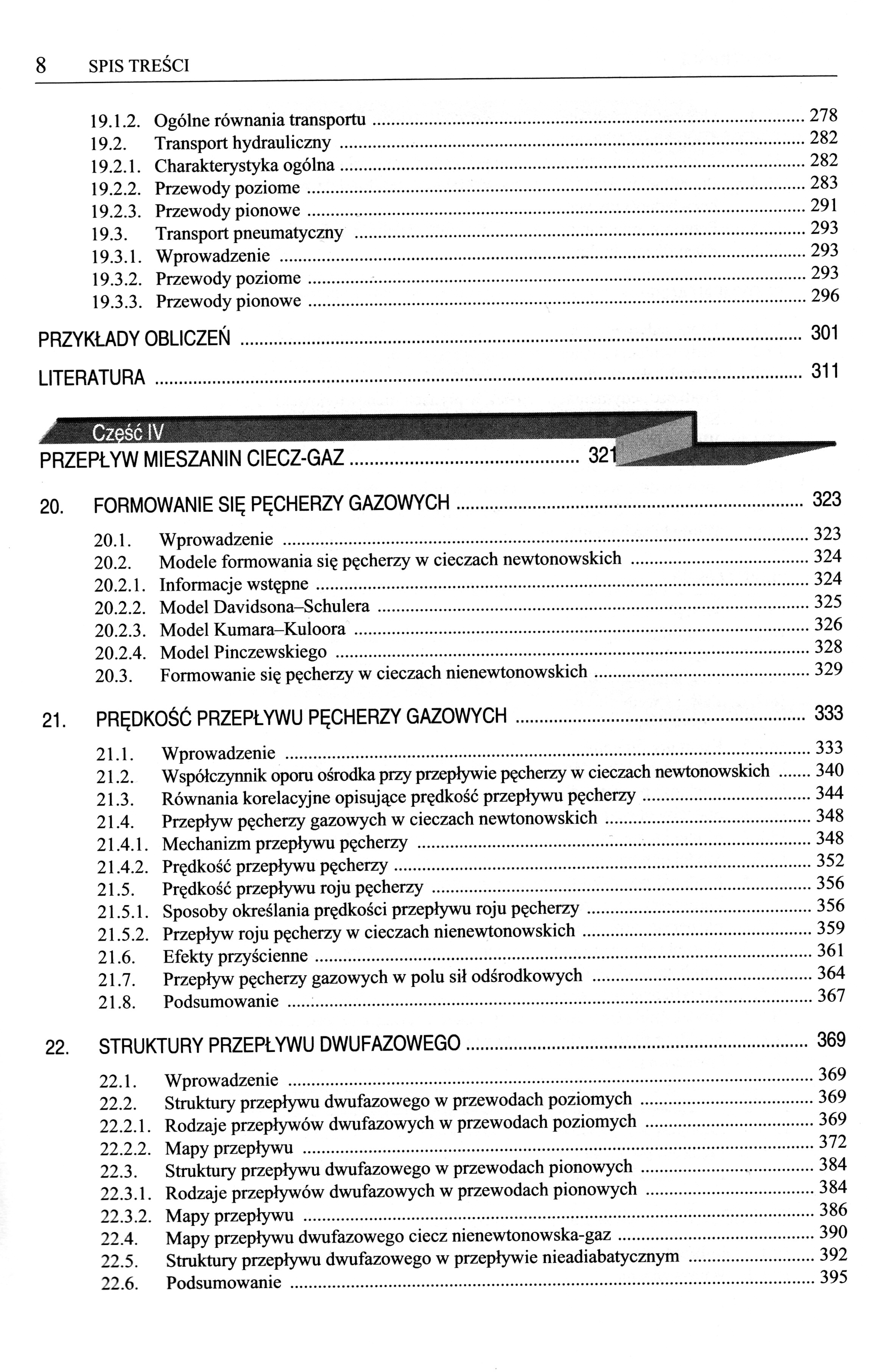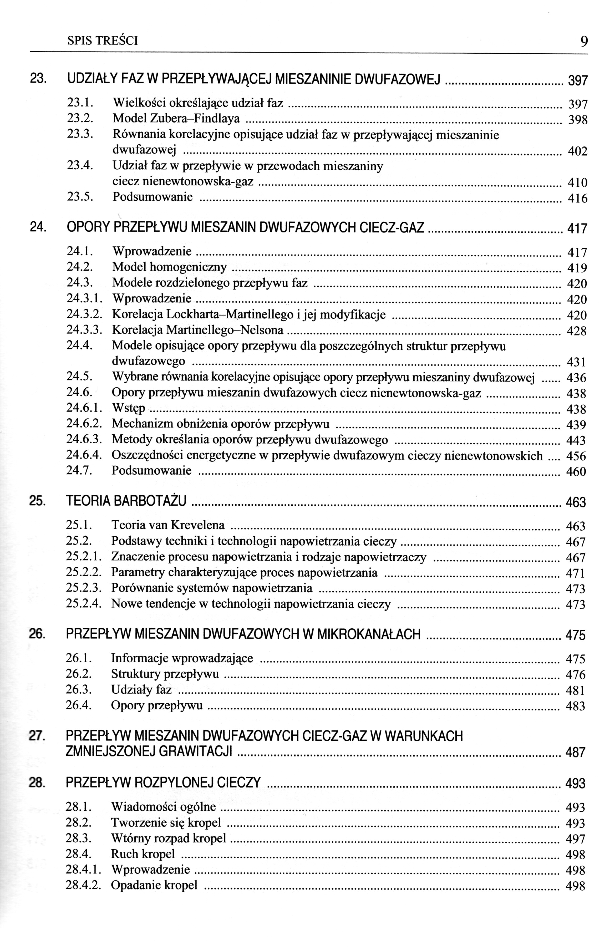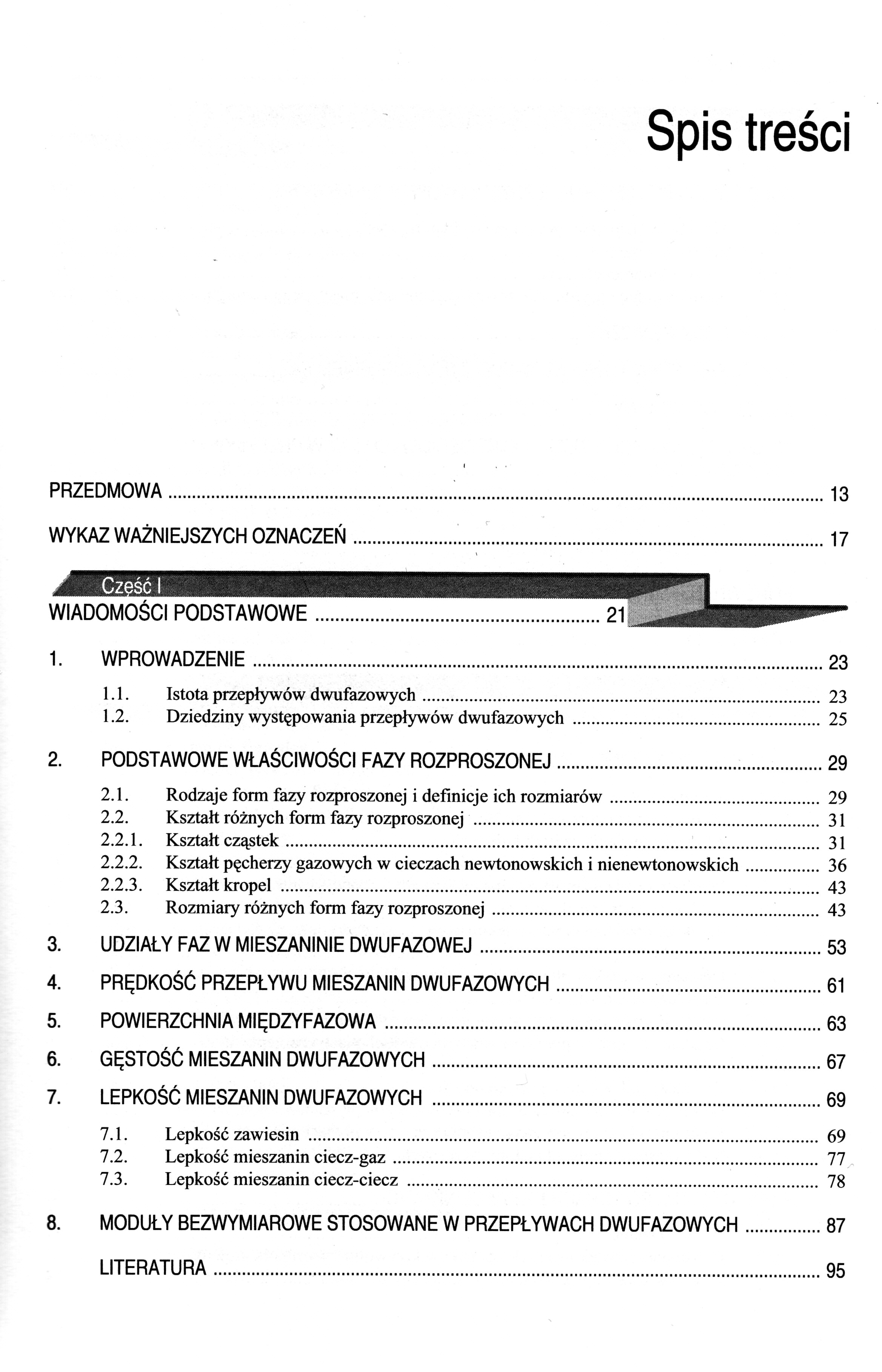 1.1.Istota przepływów dwufazowych 1.2.Dziedziny występowania przepływów dwufazowych 2.PODSTAWOWE WŁAŚCIWOŚCI FAZY ROZPROSZONEJ 2.1.Rodzaje form fazy rozproszonej i definicje ich rozmiarów 2.2.Kształt różnych form fazy rozproszonej 2.2.1.Kształt cząstek 2.2.2.Kształt pęcherzy gazowych w cieczach newtonowskich i nienewtonowskich 2.2.3.Kształt kropel 2.3.Rozmiary różnych form fazy rozproszonej 3.UDZIAŁY FAZ W MIESZANINIE DWUFAZOWEJ 4.PRĘDKOŚĆ PRZEPŁYWU MIESZANIN DWUFAZOWYCH 5.POWIERZCHNIA MIĘDZYFAZOWA 6.GĘSTOŚĆ MIESZANIN DWUFAZOWYCH 7.LEPKOŚĆ MIESZANIN DWUFAZOWYCH 7.1.Lepkość zawiesin 7.2.Lepkość mieszanin ciecz-gaz 7.3.Lepkość mieszanin ciecz-ciecz 8.MODUŁY BEZWYMIAROWE STOSOWANE W PRZEPŁYWACH DWUFAZOWYCH 9.PODSTAWY OPISU MECHANIKI PRZEPŁYWÓW DWUFAZOWYCH 9.1. Metody modelowania przepływów dwufazowych 9.1.1.Metoda fenomenologiczna 9.1.2.Formułowanie i uśrednianie równań zachowania masy, pędu i energii 10.MODEL HOMOGENICZNY 11.MODEL PRZEPŁYWU DWUFAZOWEGO Z ROZDZIELENIEM FAZ 12.MODEL POŚLIZGOWY 13.PROFILE PRĘDKOŚCI I STĘŻEŃ OBJĘTOŚCIOWYCH FAZ W PRZEPŁYWACH DWUFAZOWYCH 13.1.Profil krzywoliniowy pojedynczy 13.2.Profil krzywoliniowy podwójny 14.PORÓWNANIE METOD MODELOWANIA PRZEPŁYWU DWUFAZOWEGO 15.OPADANIE SWOBODNE CZĄSTEK W PŁYNIE 15.1.Współczynnik oporu ośrodka 15.2.Prędkość opadania cząstek kulistych 15.3.1.Równania opisujące prędkość opadania cząstek 15.3.2.Prędkość opadania cząstki o znanej średnicy i znanej gęstości 15.3.3.Średnica cząstki opadającej ze znaną prędkością 15.4.Prędkość opadania cząstek niekulistych 15.5.Nieustalone opadanie cząstek 15.6.Opadanie cząstek w płynach nienewtonowskich 15.6.1.Współczynnik oporu ośrodka 15.6.2.Prędkość opadania cząstki w płynie nienewtonowskim 15.6.3.Opadanie cząstek w płynach nienewtonowskich plastycznolepkich 15.7.Efekty przyścienne 15.7.1.Współczynnik efektów przyściennych 15.7.2.Efekty przyścienne podczas opadania cząstek w płynach newtonowskich 15.7.3.Efekty przyścienne podczas opadania cząstek w płynach nienewtonowskich 15.8.Ruch cząstek w polu sił elektrostatycznych 16. RUCH CZĄSTEK PO TORACH KRZYWOLINIOWYCH 16.1.Równanie różniczkowe ruchu cząstki w krzywoliniowym polu prędkości płynu 16.2.Przepływ cząstki przez kolano 16.4.Odpylanie grawitacyjne i bezwładnościowe 16.4.1.Charakterystyka ogólna 16.4.2.Przepływ mieszanin dwufazowych gaz-cząstki ciała stałego w komorach osadczych 16.4.3.Przepływ mieszanin dwufazowych płyn-cząstki ciała stałego w odpylaczach bezwładnościowych 16.5.Przepływ mieszaniny gaz-cząstki ciała stałego w cyklonie 16.6.Klasyfikacja hydrauliczna 17.SEDYMENTACJA 17.1.Istota sedymentacji 17.2.Sedymentacja zawiesin monodyspersyjnych 17.2.1.Metody określania prędkości sedymentacji 17.2.2.Prędkość sedymentacji cząstek w płynach nienewtonowskich 17.3.Sedymentacja zawiesin polidyspersyjnych 17.3.1.Model Richardsona-Shabi 1773.1.Inne modele sedymentacji zawiesin polidyspersyjnych 17.4.Teoria płytkiej sedymentacji wielostrumieniowej 17.5.Wirówki sedymentacyjne 18.FLUIDYZACJA 18.2.1.Istota fluidyzacji 18.2.2.Podobieństwo złoża fluidalnego do cieczy 18.2.3.Zalety i wady fluidyzacji 18.2.4.Zastosowanie fluidyzacji 18.2.5.Kolumny fluidalne 18.2.6.Charakterystyka złóż fluidalnych 18.3.Prędkość początku fluidyzacji 18.3.1.Sposoby obliczania prędkości początku fluidyzacji 18.3.2.Model kapilarny 18.3.3.Model opływowy 18.3.4.Prędkość początku fluidyzacji dla złóż wielofrakcyjnych 18.4.Fluidyzacja jednorodna 18.4.1.Ekspansja złoża jednorodnego 18.4.2.Warunki stateczności fluidyzacji jednorodnej 18.5.Fluidyzacja niejednorodna 18.5.1.Klasyfikacja fazy stałej 18.5.2.Model fluidyzacji dwufazowej 18.5.3.Struktura fluidyzacji niejednorodnej 18.5.4.Powstawanie i ruch pęcherzy 18.5.5.Ruch fazy stałej 18.5.6.Fluidyzacja płytkich złóż gruboziarnistych 18.6.Fluidyzacja w cieczach nienewtonowskich 18.6.1.Prędkość początku fluidyzacji 18.6.2.Ekspansja złoża fluidalnego 19.TRANSPORT FAZY STAŁEJ W PRZEWODACH 19.1.2.Ogólne równania transportu 19.2.Transport hydrauliczny 19.2.1.Przewody poziome 19.2.2.Przewody pionowe 19.3.Transport pneumatyczny 19.3.1.Przewody poziome 19.3.2.Przewody pionowe PRZEPŁYW MIESZANIN CIECZ-GAZ 20.FORMOWANIE SIĘ PĘCHERZY GAZOWYCH 20.1.Modele formowania się pęcherzy w cieczach newtonowskich 20.2.1.Model Davidsona-Schulera 20.2.2.Model Kumara-Kuloora 20.2.3.Model Pinczewskiego 20.3.Formowanie się pęcherzy w cieczach nienewtonowskich 21.PRĘDKOŚĆ PRZEPŁYWU PĘCHERZY GAZOWYCH 21.1.Współczynnik oporu ośrodka przy przepływie pęcherzy w cieczach newtonowskich 21.2.Równania korelacyjne opisujące prędkość przepływu pęcherzy 21.3.Przepływ pęcherzy gazowych w cieczach newtonowskich 21.4.1.Mechanizm przepływu pęcherzy 21.4.2.Prędkość przepływu pęcherzy 21.5.Prędkość przepływu roju pęcherzy 21.5.1.Sposoby określania prędkości przepływu roju pęcherzy 21.5.2.Przepływ roju pęcherzy w cieczach nienewtonowskich 21.6.Efekty przyścienne 21.7.Przepływ pęcherzy gazowych w polu sił odśrodkowych 22. STRUKTURY PRZEPŁYWU DWUFAZOWEGO 22.1.Struktury przepływu dwufazowego w przewodach poziomych 22.2.1.Rodzaje przepływów dwufazowych w przewodach poziomych 22.2.2.Mapy przepływu 22.3.Struktury przepływu dwufazowego w przewodach pionowych 22.3.1.Rodzaje przepływów dwufazowych w przewodach pionowych 22.3.2.Mapy przepływu 22.4.Mapy przepływu dwufazowego ciecz nienewtonowska-gaz 22.5.Struktury przepływu dwufazowego w przepływie nieadiabatycznym 23.UDZIAŁY FAZ W PRZEPŁYWAJĄCEJ MIESZANINIE DWUFAZOWEJ 23.1.Wielkości określające udział faz 23.2.Model Zubera-Findlaya 23.3.Równania korelacyjne opisujące udział faz w przepływającej mieszaninie dwufazowej 23.4.Udział faz w przepływie w przewodach mieszaniny ciecz nienewtonowska-gaz 24.OPORY PRZEPŁYWU MIESZANIN DWUFAZOWYCH CIECZ-GAZ 24.1.Model homogeniczny 24.