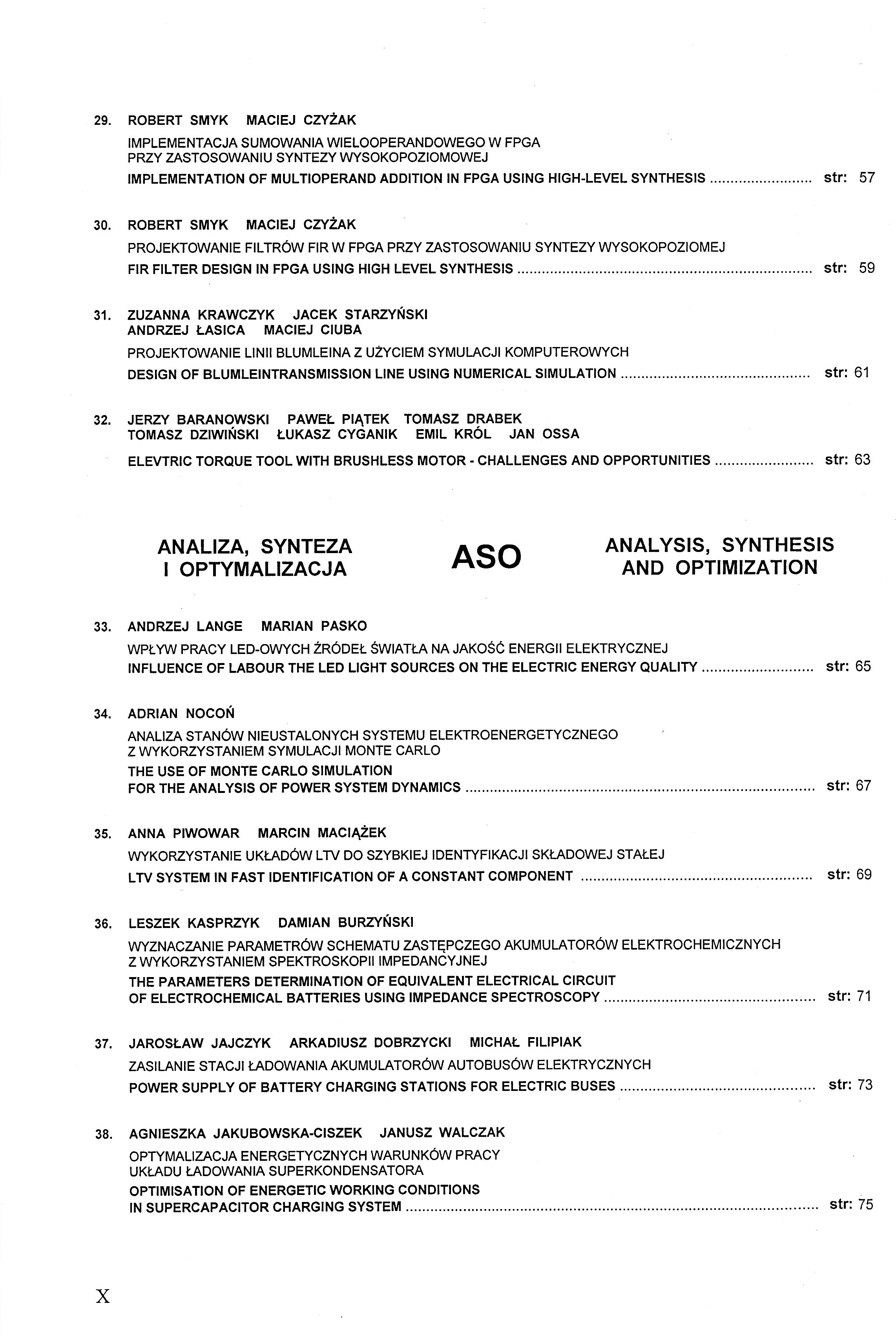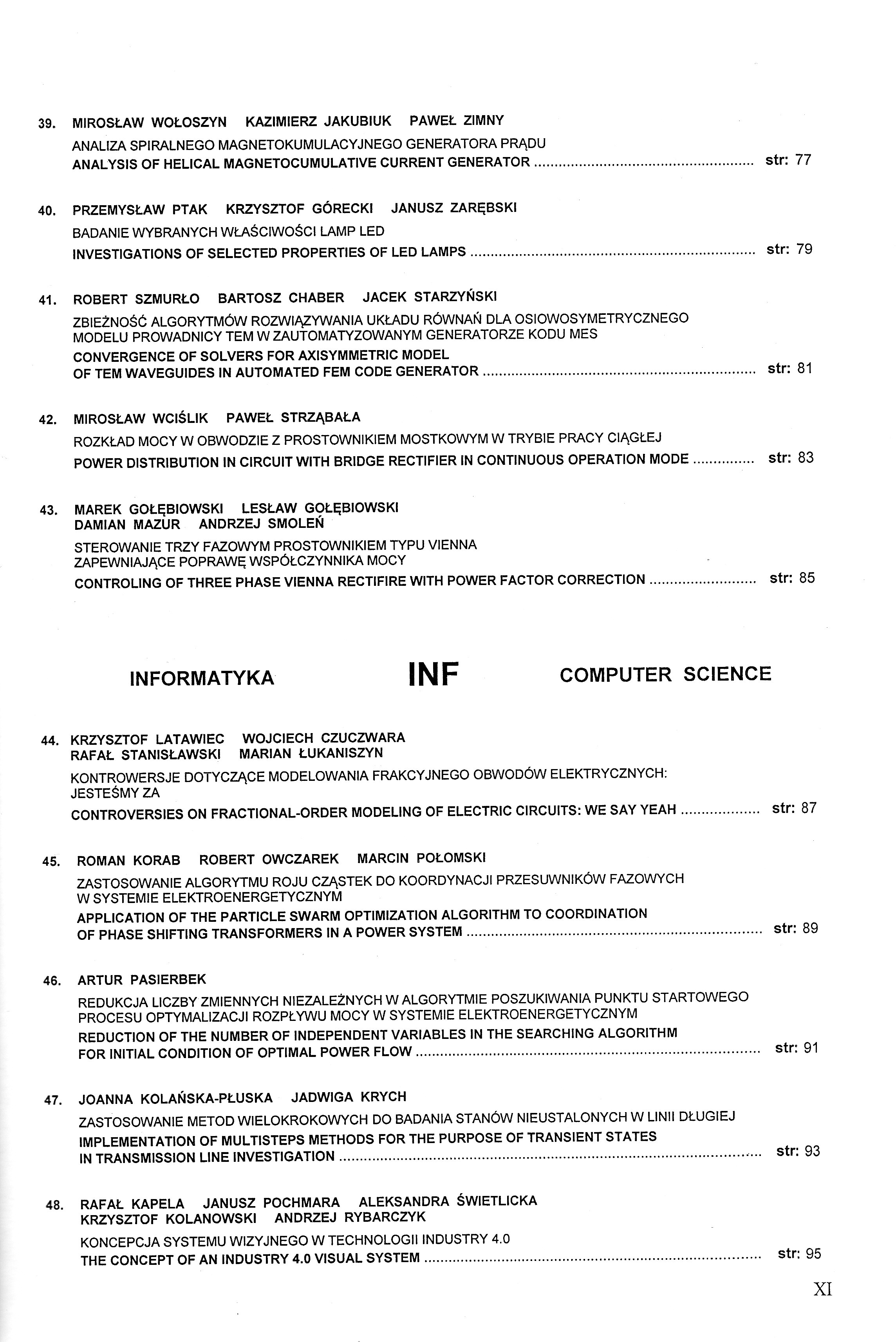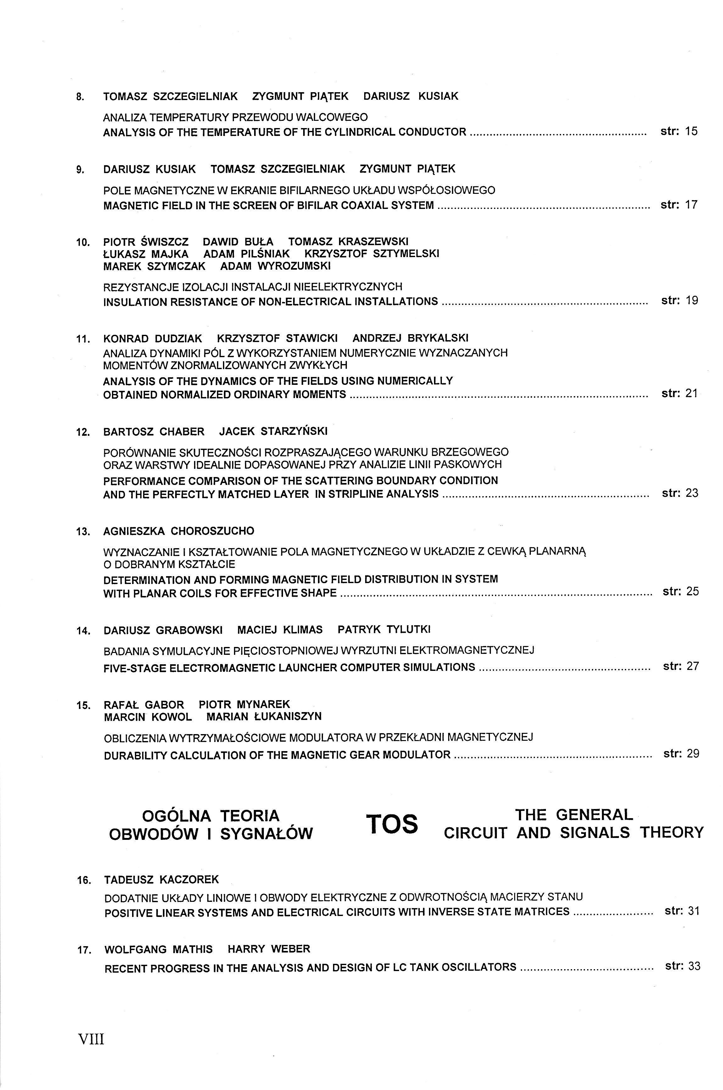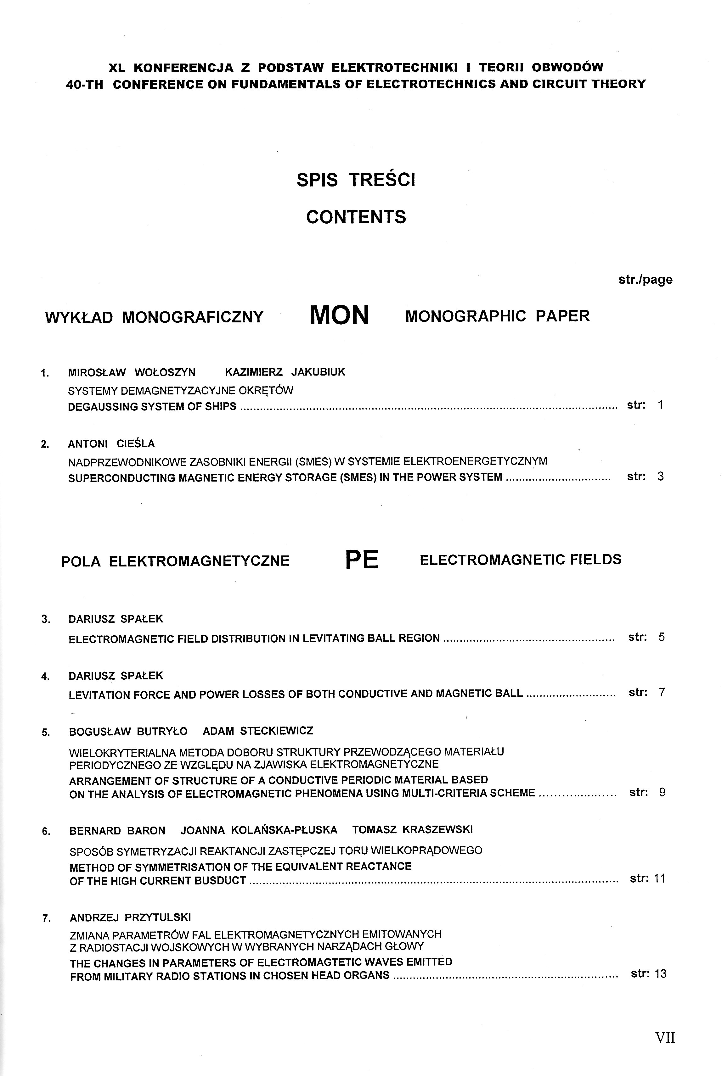 WYKŁAD MONOGRAFICZNY MON MONOGRAPHIC PAPER 1. MIROSŁAW WOŁOSZYN KAZIMLERZ JAKUBIUK SYSTEMY DEMAGNETYZACYJNE OKRĘTÓW DEGAUSSING SYSTEM OF SHIPS 2. ANTONI CIEŚLA NADPRZEWODNIKOWE ZASOBNIKI ENERGII (SMES) W SYSTEMIE ELEKTROENERGETYCZNYM SUPERCONDUCTTING MAGNETIC ENERGY STORAGE (SMES) LN THE POWER SYSTEM POLA ELEKTROMAGNETYCZNE PE ELECTROMAGNETIC FIELDS 3. DARIUSZ SPAŁEK ELECTROMAGNETIC FIELD DISTRIBUTION IN LEVITATING BALL REGION 4. DARIUSZ SPAŁEK LEVITATION FORCE AND POWER LOSSES OF BOTH CONDUCTIVE AND MAGNETIC BALL 5. BOGUSŁAW BUTRYŁO ADAM STECKIEWCZ WIELOKRYTERIALNA METODA DOBORU STRUKTURY PRZEWODZĄCEGO MATERIAŁU PERIODYCZNEGO ZE WZGLĘDU NA ZJAWISKA ELEKTROMAGNETYCZNE ARRANGEMENT OF STRUCTURE OF A CONDUCTIVE PERIODIC MATERIAL BASED ON THE ANALYSIS OF ELECTROMAGNETIC PHENOMENA USING MULTI-CRITERIA SCHEME 6. BERNARD BARON JOANNA KOLAŃSKA-PŁUSKA TOMASZ KRASZEWSKI SPOSÓB SYMETRYZACJI REAKTANCJI ZASTĘPCZEJ TORU WIELKOPRĄDOWEGO METHOD OF SYMMETRISATION OF THE EQUIVALENT REACTANCE OF THE HIGH CURRENT BUSDUCT 7. ANDRZEJ PRZYTULSKI ZMIANA PARAMETRÓW FAL ELEKTROMAGNETYCZNYCH EMITOWANYCH Z RADIOSTACJI WOJSKOWYCH W WYBRANYCH NARZĄDACH GŁOWY THE CHANGES IN PARAMETERS OF ELECTROMAGTETIC WAVES EMITTED FROM MILITARY RADIO STATIONS lN CHOSEN HEAD ORGANS 8. TOMASZ SZCZEGIELNIAK ZYGMUNT PIĄTEK DARIUSZ KUSIAK ANALIZA TEMPERATURY PRZEWODU WALCOWEGO ANALYSIS OF THE TEMPERATURE OF THE CYLINDRICAL CONDUCTOR 9. DARIUSZ KUSIAK TOMASZ SZCZEGIELNIAK ZYGMUNT PIĄTEK POLE MAGNETYCZNE W EKRANIE BIFILARNEGO UKŁADU WSPÓŁOSIOWEGO MAGNETIC FIELD IN THE SCREEN OF BIFILAR COAXIAL SYSTEM 10. PIOTR ŚWISZCZ DAWID BUŁA TOMASZ KRASZEWSKI ŁUKASZ MAJKA ADAM PILŚNIAK KRZYSZTOF SZTYMELSKI MAREK SZYMCZAK ADAM WYROZUMSKI REZYSTANCJE IZOLACJI I NSTALACJI NIEELEKTRYCZNYCH INSULATION RESISTANCE OF NON-ELECTRICAL INSTALLATIONS 11. KONRAD DUDZIAK KRZYSZTOF STAWICKI ANDRZEJ BRYKALSKI ANALIZA DYNAMIKI PÓL Z WYKORZYSTANIEM NUMERYCZNE WYZNACZANYCH MOMENTÓW ZNORMALIZOWANYCH ZWYKŁYCH ANALYSIS OF THE DYNAMICS OF THE FIELDS USING NUMERICALLY OBTAINED NORMALIZED ORDINARY MOMENTS 12. BARTOSZ CHABER JACEK STARZYŃSKI PORÓWNANIE SKUTECZNOŚCI ROZPRASZAJĄCEGO WARUNKU BRZEGOWEGO ORAZ WARSTWY IDEALNIE DOPASOWANEJ PRZY ANALIZIE LINII PASKOWYCH PERFORMANCE COMPARISON OF THE SCATTERING BOUNDARY CONDITION AND THE PERFECTLY MATCHED LAYER IN STRIPLINE ANALYSIS 13. AGNIESZKA CHOROSZUCHO WYZNACZANIE I KSZTAŁTOWANIE POLA MAGNETYCZNEGO W UKŁADZIE Z CEWKĄ PLANARNĄ O DOBRANYM KSZTAŁCIE DETERMINATION AND FORMING MAGNETIC FIELD DISTRIBUTION IN SYSTEM WITH PLANAR COILS FOR EFFECTIVE SHAPE 14. DARIUSZ GRABOWSKI MACIEJ KLIMAS PATRYK TYLUTKI BADANIA SYMULACYJNE PIĘCIOSTOPNIOWEJ WYRZUTNI ELEKTROMAGNETYCZNEJ FIVE-STAGE ELECTROMAGNETIC LAUNCHER COMPUTER SIMULATIONS 15. RAFAŁ GABOR PIOTR MYNAREK MARCIN KOWOL MARIAN ŁUKANISZYN OBLICZENIA WYTRZYMAŁOŚCIOWE MODULATORA W PRZEKŁADNI MAGNETYCZNEJ DURABILITY CALCULATION OF THE MAGNETIC GEAR MODULATOR OGÓLNA TEORIA OBWODÓW I SYGNAŁÓW TOS THE GENERAL CIRCUIT AND SIGNALS THEORY 16. TADEUSZ KACZOREK DODATNIE UKŁADY LINIOWE I OBWODY ELEKTRYCZNE Z ODWROTNOŚCIĄ MACIERZY STANU POSITIVE LINEAR SYSTEMS AND ELECTRICAL CIRCUITS WITH INVERSE STATE MATRICES 17. WOLFGANG MATHIS HARRY WEBER RECENT PROGRESS IN THE ANALYSIS AND DESIGN OF LC TANK OSCILLATORS 18. KRZYSZTOF SIWEK STANISŁAW OSOWSKI TOMASZ GRZYWACZ PROGNOZOWANIE PRZYROSTOWE OBCIĄŻEŃ ELEKTROENERGETYCZNYCH INCREMENTAL APPROACH TO LOAD FORECASTING IN POWER SYSTEM 19. WOJCIECH MITKOWSKI UWAGI O DODATNICH OBWODACH ELEKTRYCZNYCH REMARKS ABOUT POSITIVE ELECTRICAL CIRCUITS 20. ANDRZEJ ZAWADZKI MACIEJ WŁODARCZYK POCHODNA UŁAMKOWA WEKTORA WIRUJĄCEGO FRACTIONAL DERIVATIVE OF THE ROTATING VECTOR 21. SEBASTIAN RÓŻOWICZ ANDRZEJ ZAWADZKI PRZEWODY ZAPŁONOWE SILNIKÓW SPALINOWYCH JAKO OBWODY O PARAMETRACH ROZŁOŻONYCH CABLES IGNITION ENGINES EXHAUST ASTHE CIRCUIT OF DISTRIBUTED CONSTANS SYSTEM 22. PIOTR PRUSKI STEFAN PASZEK ANALIZA MODALNA PRZEBIEGÓW MOCY CHWILOWEJ W SYSTEMIE ELEKTROENERGETYCZNYM PRZY ZAKŁÓCENIACH ZWARCIOWYCH MODAL ANALYSIS OF INSTANTANEOUS POWER WAVEFORMS IN POWER SYSTEM AT SHORT-CIRCUIT DISTURBANCES 23. RYSZARD NAWROWSKI ZBLGNIEW STEIN MARIA ZIELIŃSKA TEMATYKA KOMPENSACJI MOCY BIERNEJ POBIERANEJ Z SIECI ELEKTROENERGETYCZNEJ PRZEZ TRÓJFAZOWE SILNIKI INDUKCYJNE 24. ŁUKASZ MAJKA POMIARY I SYMULACJE OBWODU FERROREZONANSOWEGO SIMULATIONS AND MEASUREMENTS IN A FERRORESONANCE CIRCUIT 25. JAROSŁAW SZCZEPANIAK WPŁYW PARAMETRÓW BŁĘDU IDENTYFIKACJI LINII DŁUGIEJ NA PARAMETRY WYJŚCIOWE THE IMPACT OF THE PARAMETRES OF A LONG LINE IDENTIFICATION ERROR ON OUTPUT PERFORMANCE 26. TOMASZ ADRIKOWSKI DAWID BUŁA MARIAN PASKO ZASTOSOWANIE ENERGETYCZNEGO FILTRU AKTYWNEGO DO DYNAMICZNEJ KOMPENSACJI MOCY BIERNEJ W UKŁADACH 3-FAZOWYCH APPLICATION OF ACTIVE POWER FILTER TO DYNAMIC COMPENSATION OF REACTIVE POWER IN 3-PHASE SYSTEMS 27. MARIAN PASKO MAREK SZYMCZAK ZASTOSOWANIE AKTYWNEGO FILTRU EMI DO REDUKCJI ZABURZEŃ PRZEWODZONYCH GENEROWANYCH PRZEZ FALOWNIK APPLICATION OF ACTIVE EMI FILTER TO REDUCTION CONDUCTED NOISE GENERATED BY A POWER INVERTER 28. MICHAŁ LEWANDOWSKI JANUSZ WALCZAK ESTYMACJA CZĘSTOTLIWOŚCI PODSTAWOWEJ SYGNAŁU ELEKTROENERGETYCZNEGO Z WYKORZYSTANIEM PĘTLI PLL ESTIMATION OF BASE FREQUENCY OF ELECTRICAL SIGNAL USING PLL 29. ROBERT SMYK MACIEJ KRZYŻAK IMPLEMENTACJA SUMOWANIA WIELOOPERANDOWEGO W FPGA PRZY ZASTOSOWANIU SYNTEZY WYSOKOPOZIOMOWEJ IMPLEMENTATION OF MULTIOPERAND ADDITION IN FPGA USING HIGH-LEVEL SYNTHESIS 30. ROBERT SMYK MACIEJ CZYŻAK PROJEKTOWANIE FILTRÓW FIR W FPGA PRZY ZASTOSOWANIU SYNTEZY WYSOKOPOZIOMEJ FIR FILTER DESIGN IN FPGA USING HIGH LEVEL SYNTHESIS 31. ZUZANNA KRAWCZYK JACEK STARZYŃSKI ANDRZEJ ŁASICA MACIEJ CIUBA PROJEKTOWANIE LINII BLUMLEINA Z UŻYCIEM SYMULACJI KOMPUTEROWYCH DESIGN OF BLUMLEINTRANSMISSION LINE USING NUMERICAL SIMULATION 32. JERZY BARANOWSKI PAWEŁ PIĄTEK TOMASZ DRABEK TOMASZ DZIWIŃSKI ŁUKASZ CYGANIK EMIL KRÓL JAN OSSA ELEVTRIC TORQUE TOOL WITH BRUSHLESS MOTOR - CHALLENG