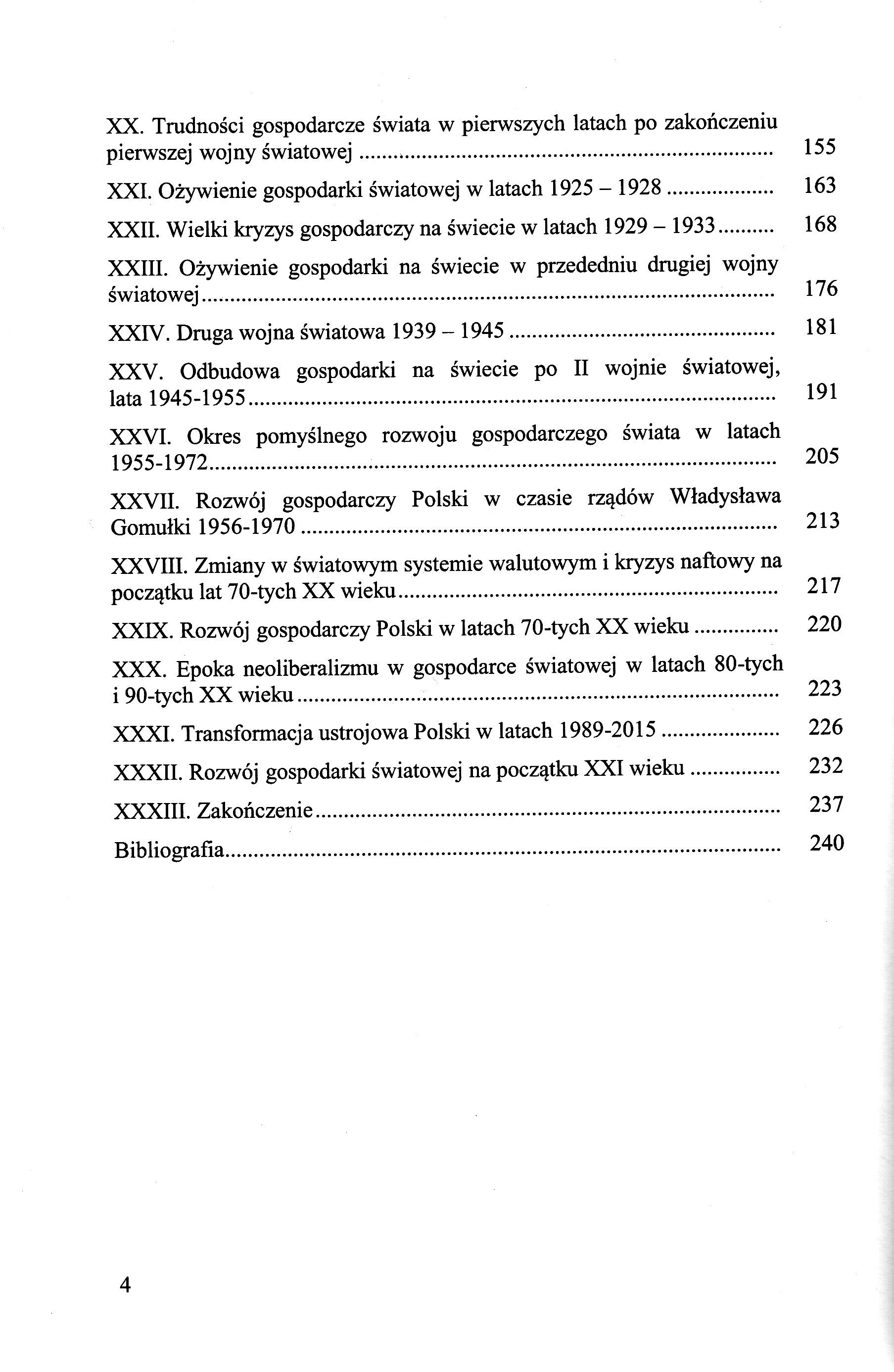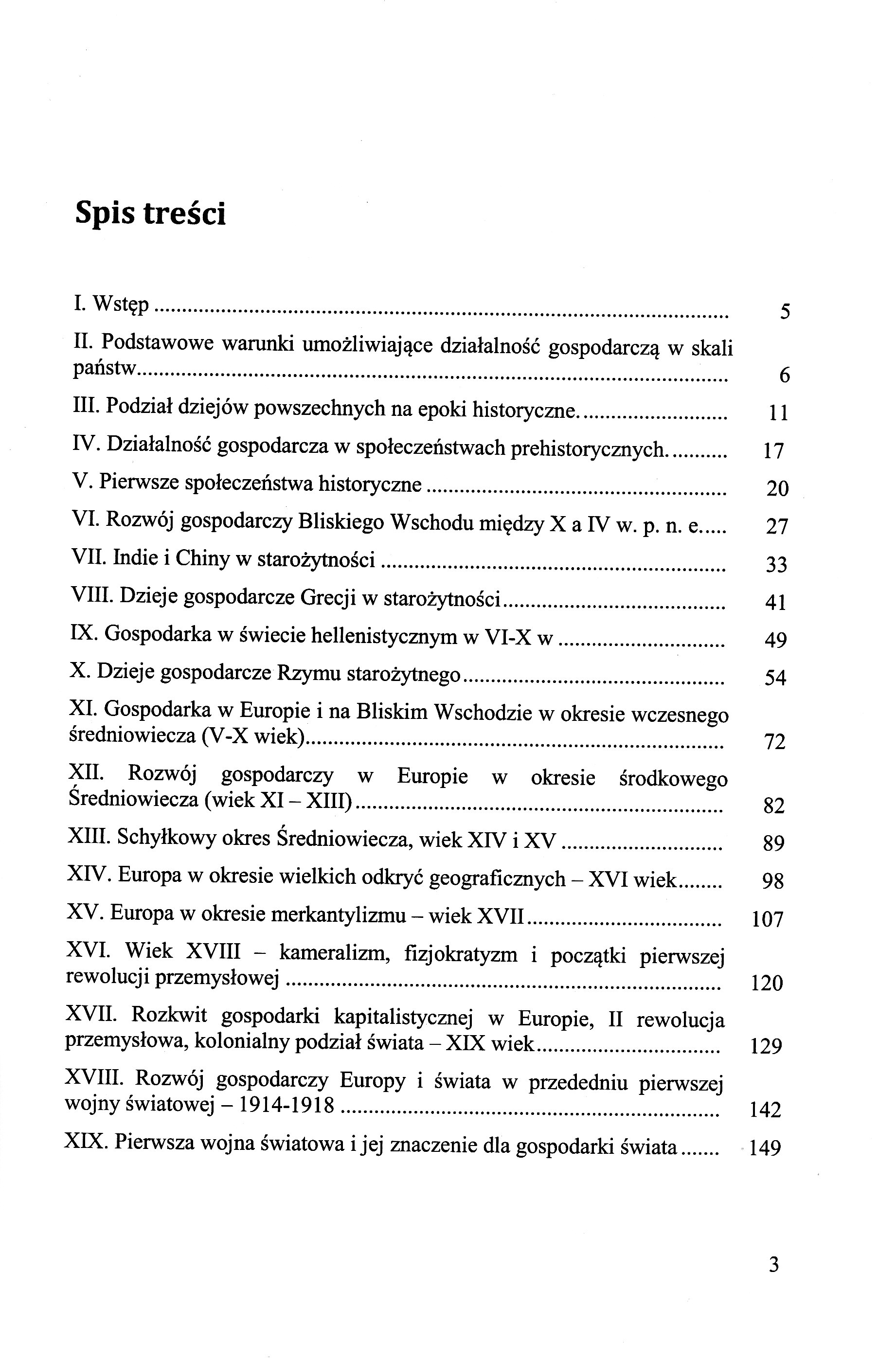 Podstawowe warunki umożliwiające działalność gospodarczą w skali państw Podział dziejów powszechnych na epoki historyczne Działalność gospodarcza w społeczeństwach prehistorycznych Pierwsze społeczeństwa historyczne Rozwój gospodarczy Bliskiego Wschodu midyz X a IV w. p. n. e. Indie i Chiny w starożytności Dzieje gospodarcze Grecji w starożytności Gospodarka w świecie hellenistycznym w VI-X w. Dzieje gospodarcze Rzymu starożytnego Gospodarka w Europie i na Bliskim wschodzie w okresie wczesnego średniowiecza (V-X wiek) Rozwój gospodarczy w Europie w okresie środkowego średniowiecza (wiek XI - XIII) Schyłkowy okres Średniowiecza, wiek XIV i XV Europa w okresie wielkich odkryć geograficznych - XVI wiek Europa w okresie merkantylizmu - wiek XVII Wiek XVIIT - kameralizm, fizjokratyzm i początki pierwszej rewolucji przemysłowej Rozkwit gospodarki kapitalistycznej w Europie, II rewolucja przemysłowa, kolonialny podział świata - XIXwiek Rozwój gospodarczy Europy i świata w przededniu pierwszej wojny światowej 1914-1918 Pierwsza wojna światowa i jej znaczenie dla gospodarki świata Trudności gospodarcze świata w pierwszych latach po zakończeniu pierwszej wojny światowej Ożywienie gospodarki światowej w latach 1925 - 1928 Wielki kryzys gospodarczy na świecie w latach 1929 - 1933 Ożywięnie gospodarki na świecie w przededniu drugiej wojny światowej Druga wojna światowa 1939 - 1945 Odbudowa gospodarki na świecie po II wojnie światowej, lata 1945-1955 Okres pomyślnego rozwoju gospodarczego świata w latach 1955-1972 Rozwój gospodarczy Polski w czasie rządów Władysława Gomułki 1956-1970 Zmiany w światowym systemie walutowym i kryzys naftowy na początku lat 70-tych XX wieku Rozwój gospodarczy Polski w latach 70-tych XX wieku Epoka neoliberalizmu w gospodarce światowej w latach 80-tych i 9O-tych XX wieku Transformacja ustrojowa Polski w latach 1989-2015 Rozwój gospodarki światowej na początku XXI wieku