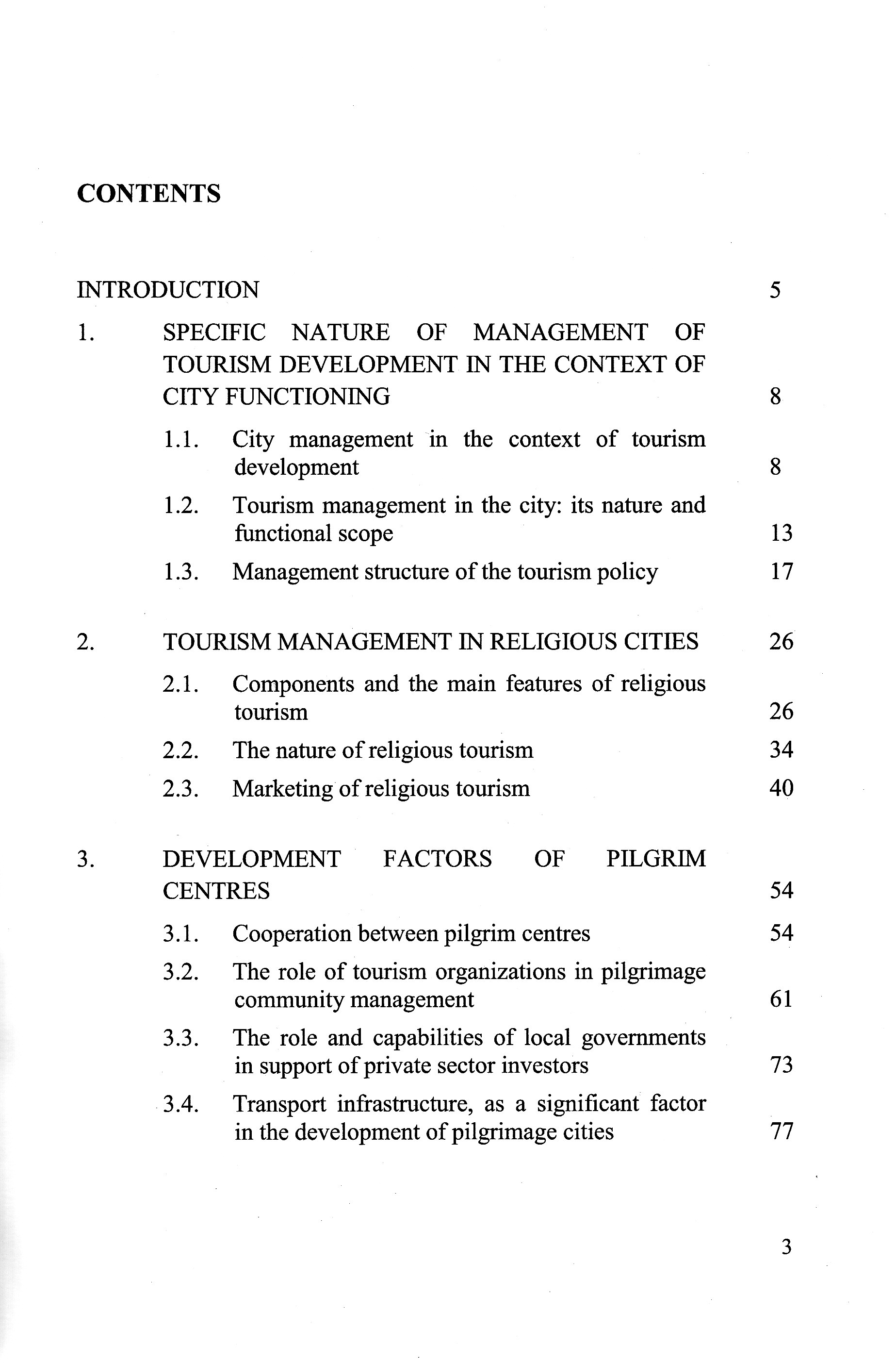 Specific nature of management of tourism development in the context of city functioning City management in the context of tourism development Tourism management in the city: its nature and functional scope Management structure of the tourism policy Tourism management in religious cities Components and the main features of religious tourism The nature of religious tourism Marketing of religious tourism Development factors of pilgrim centres Cooperation between pilgrim centres The role of tourism organizations in pilgrimage community management The role and capabilities of local governments in support of private sector investors Transport infrastructure, as a significant factor in the development of pilgrimage cities Pilgrim city development index (PCDI) - evaluation method of specific areas of Pilgrim cities development Characteristics of selected pilgrim cities Characteristics of pilgrims and evaluation of the image of the cities studied Pilgrim City Development Index (PCDI) description of the method The study of pilgrim city development using the author's PCDI method