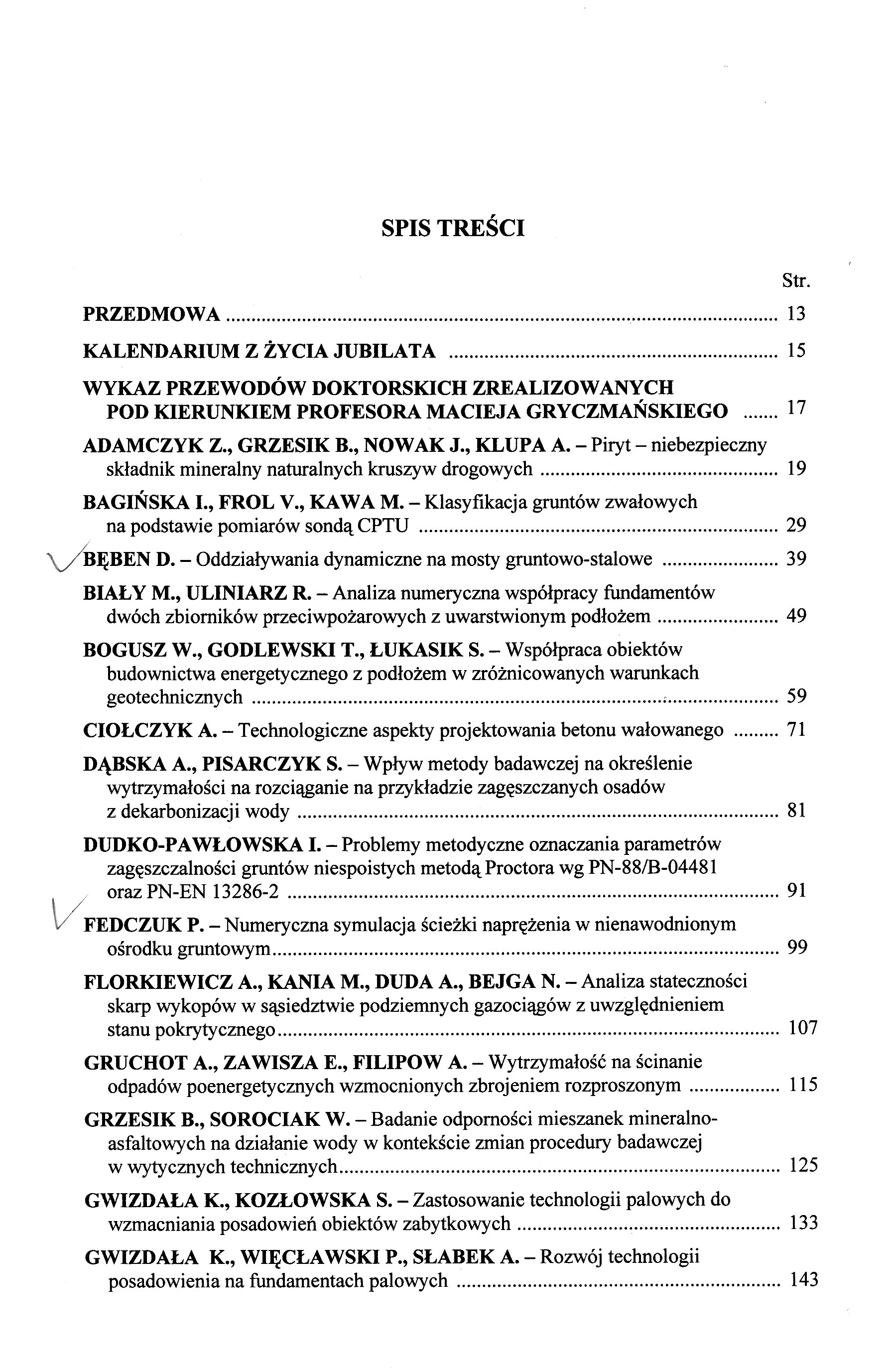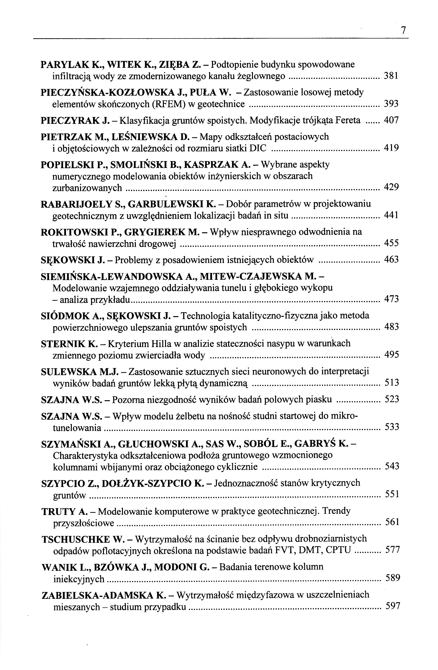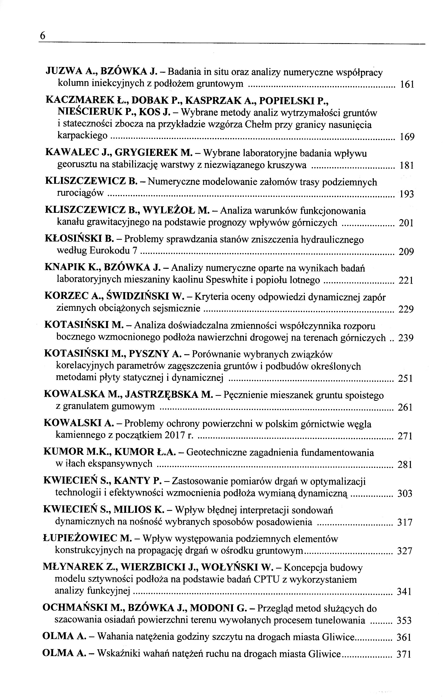 Adamczyk Z., Grzesik B., Nowak J., Klupa A. - Piryt – niebezpieczny składnik mineralny naturalnych kruszyw drogowych Bagińska I., Frol V. Kawa M. Klasyfikacja gruntów z wałowych na podstawie pomiarów sondą CPTU Bęben D. - oddziaływania dynamiczne na mosty gruntowo-stalowe Biały M., Uliniarz R. Analiza numeryczna współpracy fundamentów dwóch zbiorników przeciwpożarowych z uwarstwionym podłożem Bogusz W., Godlewski T., Łukasik S. - Współpraca obiektów budownictwa energetycznego z podłożem w zróżnicowanych warunkach geotechnicznych Ciołczyk A. - Technologiczne aspekty projektowania betonu wałowanego Dąbska A., Pisarczyk S. - Wpływ metody badawczej na określenie wytrzymałości na rozciąganie na przykładzie zagęszczanych osadów z dekarbonizacji wody Dudko-Pawłowska. - Problemy metodyczne oznaczania parametrów zagęszczalności gruntów niespoistych metodą Proctora wg PN-88/B_04481 oraz PN-EN 13286-2 Fedczuk P. - Numeryczna symulacja ścieżki naprężenia w nienawodnionym ośrodku gruntowym. Florkiewicz A., Kania M.' Duda A., Bejga N. -Analiza stateczności skarp wykopów w sąsiedztwie podziemnych gazociągów z uwzględnieniem stanu pokrytycznego. Gruchot A., Zawisza E., Filipow A. Wytrzymałość na ścinanie odpadów poenergetycznych wzmocnionych zbrojeniem rozproszonym Grzesik B., Sorociak W. - Badanie odporności mieszanek mineralno-asfaltowych na działanie wody w kontekście zmian procedury badawczej w wytycznych technicznych. Gwizdała K., Kozłowska S. - Zastosowanie technologii palowych do wzmacniania posadowień obiektów zabytkowych Gwizdała K., Więcławski P., Słabek A. - Rozwój technologii posadowienia na fundamentach palowy Juzwa A., Bzówka J. -Badania in situ oraz analizy numeryczne współpracy kolumn iniekcyjnych z podłożem gruntowym Kaczmarekł.' Dobak P.' Kasprzaka.' Popielski P.'Niescieruk P.' Kos J. - Wybrane metody analiz wytrzymałości gruntów i stateczności zbocza na przykładzie wzgórza Chełm przy granicy nasunięcia karpackiego Kawalec J.' Grygierek M. - Wybrane laboratoryjne badania wpływu georusztu na stabilizację warstwy z niezwiązanego kruszywa Kliszczewlcz B. Numeryczne modelowanie załomów trasy podziemnych rurociągów Kliszczewicz B., Wyleżoł M. - Analiza warunków funkcjonowania kanału grawitacyjnego na podstawie prognozy wpływów górniczych Kłosiński B. - Problemy sprawdzania stanów zniszczenia hydraulicznego według Eurokodu 7 .Knapik K., Bzówka J. _ Analizy numeryczne oparte na wynikach badań laboratoryjnych mieszaniny kaolinu Speswhite i popiołu lotnego Korzec Ł., Śwrozrńskl w. - Kryteria oceny odpowiedzi dynamicznej zapór ziemnych obciążonych sejsmicznie Kotasiński M. - Analiza doświadczalna zmienności współczynnika rozporu bocznego wzmocnionego podłoża nawierzchni drogowej na terenach górniczych Kotasiński M., PYSZNY A. - Porównanie wybranych związków korelacyjnych parametrów zagęszczenia gruntów i podbudów określonych metodami płyty statycznej i dynamicznej Kowalska M.' Jastrzębska M. -Pęcznienie mieszanek gruntu spoistego z granulatem gumowym Kowalski A. Problemy ochrony powierzchni w polskim górnictwie węgla kamiennego z początkiem 2017 r. Kumor M.K.' Kumor Ł.A. - Geotechniczne zagadnienia fundamentowania w siłach ekspansywnych Kwiecień S., Kanty P. - Zastosowanie pomiarów drgań w optymalizacji technologii i efektywności wzmocnienia podłoża wymianą dynamiczną. Kwiecień S., Milios K. - Wpływ błędnej interpretacji sondowań dynamicznych na nośność wybranych sposobów posadowienia Łupiezowiec M. _ Wpływ występowania podziemnych elementów konstrukcyjnych na propagację drgań w ośrodku gruntowym Młynarek Z.,Wierzbicki J.' Wołyński W. - Koncepcja budowy modelu sztywności podłoża na podstawie badań CPTU z wykorzystaniem analizy funkcyjnej .Ochmański M., Bzówka J., Modoni G. - Przegląd metod służących do szacowania osiadań powierzchni terenu wywołanych procesem tunelowania Olma A. Wahania natężenia godziny szczytu na drogach miasta Gliwice. OLMA A. - Wskaźniki wahań natężenia ruchu na drogach miasta Gliwice. Parylak K., Witek K.' Zięba Z. -Podtopienie budynku spowodowane infiltracją wody ze zmodemizowanego kanału żeglownego Pieczyńska-Kozłowska J., Puła W. - Zastosowanie losowej metody elementów skończonych (MEM) w geotechnice Pieczyrak J. - Klasyfikacja gruntów spoistych. Modyfikacje trójkąta Fereta Pietrzak M., Leśniewska D. - Mapy odkształceń postaciowych i objętościowych w zależności od rozmiaru siatki DIC 'Popielski P., Smoliński B., Kasprzak A. - Wybrane aspekty numerycznego modelowania obiektów inżynierskich w obszarach zurbanizowanych Rabarijoely s., Garbuiewski K. - Dobór parametrów w projektowaniu geotechniczym z uwzględnieniem lokalizacji badań in situ Rokitowski P., Grygierek M. - Wpływ niesprawnego odwodnienia na trwałość nawierzchni drogowej Sękowski J. - Problemy z posadowieniem istniejących obiektów Siemińska-Lewandowska A., Mitew-Czajewska M. -Modelowanie wzajemnego oddziaływania tunelu i głębokiego wykopu - analiza przykładu..... Siódmok A., Sękowski J. - Technologia kataliczno-fizyczna jako metoda powierzchniowego ulepszania gruntów spoistych Sternik K. - Kryterium Hilla w analizie stateczności nasypu w warunkach zmiennego poziomu zwierciadła wody Sulewska M.J. - Zastosowanie sztucznych sieci neuronowych do interpretacji wyników badań gruntów lekką płytą dynamiczną Szajna W.S. - Pozorna niezgodność wyników badań polowych piasku Szajna W.S. - Wpływ modelu żelbetu na nośność studni startowej do mikro tunelowania Szymański A., Głuchowskia., Sas w., Soból E., Gabryś K. Charakterystyka odkszałceniowa podłoża gruntowego wzmocnionego kolumnami wbijanymi oraz obciążonego cyklicznie Szypcio Z., Dołżyk-Szypcio K. - Jednoznaczność stanów krytycznych gruntów TRUTY A. - Modelowanie komputerowe w praktyce geotechniczej. Trendy przyszłości