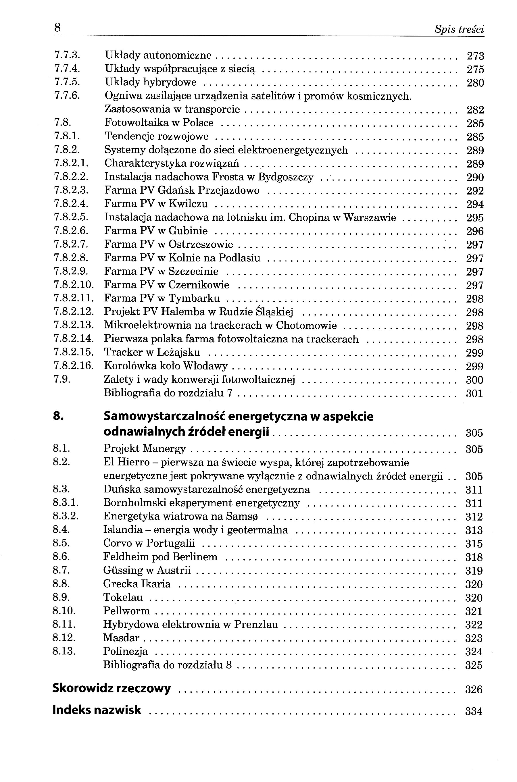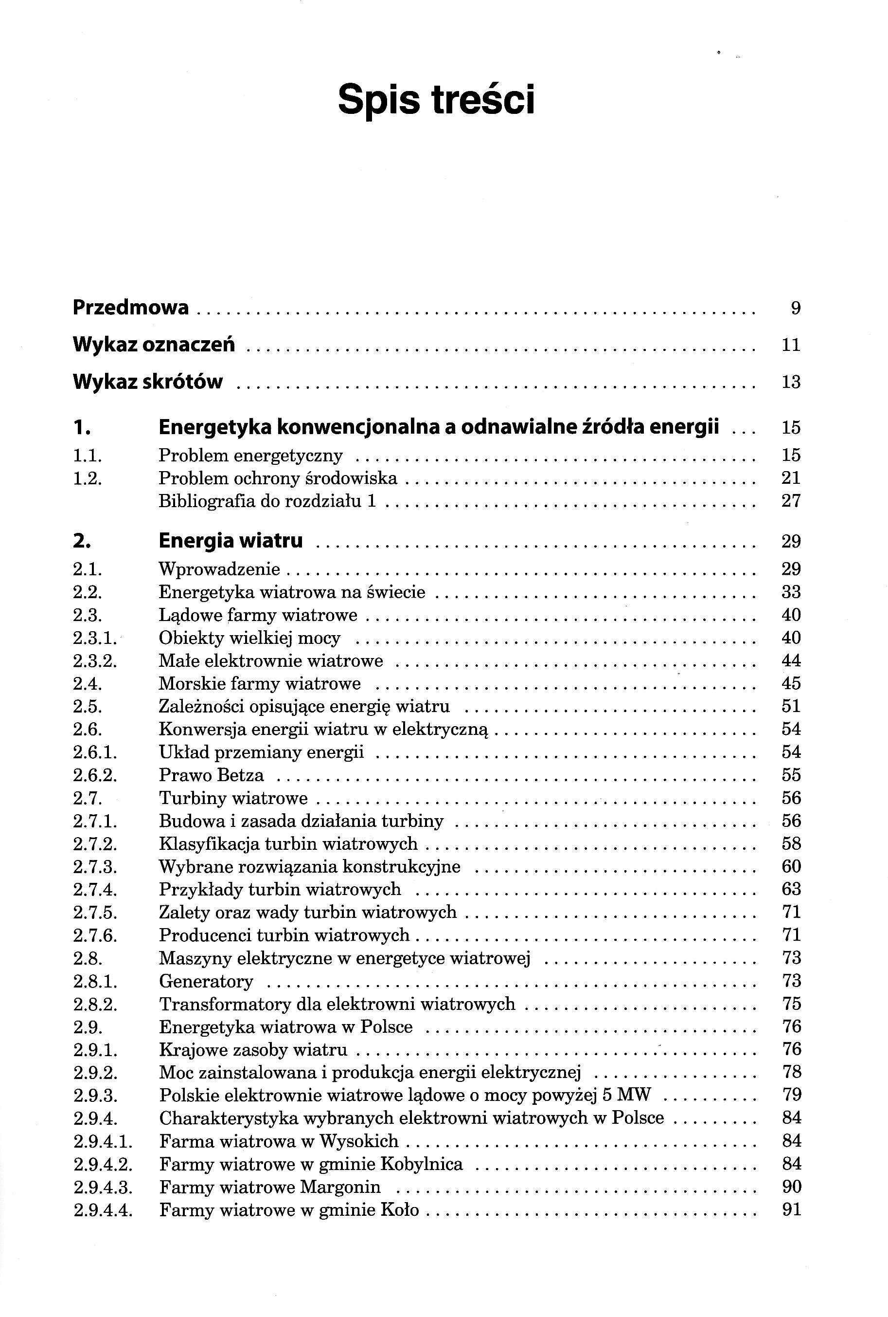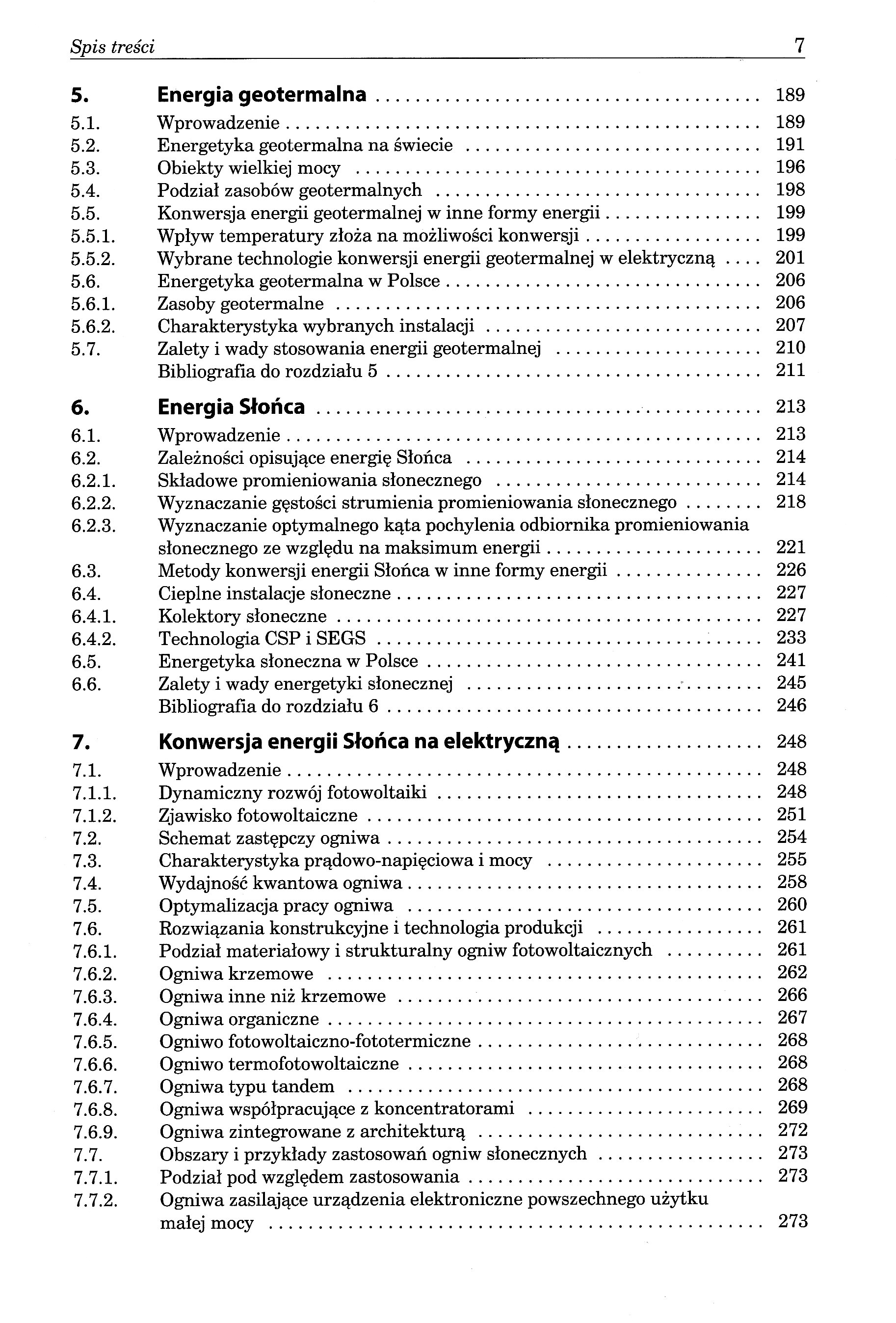 1. Energetyka konwencjonalna a odnawialne źródła energii 1.1. Problem energetyczny 1.2. Problem ochrony środowiska 2. Energia wiatrowa 2.2. Energetyka wiatrowa na świecie 2.3. Lądowe farmy wiatrowe 2.3.1. Obiekty wielkiej mocy 2.3.2. Małe elektrownie wiatrowe 2.4. Morskie farmy wiatrowe 2.5. Zależności opisujące energię wiatrową 2.6. Konwersja energii wiatrowej w elektryczną 2.6.1. Układ przemiany energii 2.6.2. Prawo Betza 2.7. Turbiny wiatrowe 2.7.1. Budowa i zasada działania turbiny 2.7.2. Klasyfikacja turbin wiatrowych 2.7.3. Wybrane rozwiązania konstrukcyjne 2.7.4. Przykłady turbin wiatrowych 2.7.5. Zalety oraz wady turbin wiatrowych 2.7.6. Producenci turbin wiatrowych 2.8. Maszyny elektryczne w energetyce wiatrowej 2.8.1. Generatory 2.8.2. Transformatory dla elektrowni wiatrowych 2.9. Energetyka wiatrowa w Polsce 2.9.1. Krajowe zasoby wiatru 2.9.2. Moc zainstalowana i produkcja energii elektrycznej 2.9.3. Polskie elektrownie wiatrowe lądowe o mocy powyżej 5 MW 2.9.4. Charakterystyka wybranych elektrowni wiatrowych w Polsce 2.9.4.1. Farma wiatrowa w Wysokich 2.9.4.2. Farmy wiatrowe w gminie Kobylnica 2.9.4.3. Farmy wiatrowe Margonin 2.9.4.4. Farmy wiatrowe w gminie Koło 2.9.4.5. Turbiny wiatrowe we wsi Paproć pod Nowym Tomyślem 2.9.4.6. Turbina wiatrowa w miejscowości Pęckowo 2.9.4.7. Farma wiatrowa Bystra 2.9.4.8. Farma wiatrowa Nowotna 2.9.5. Polska energetyka wiatrowa na morzu 2.10. Wybrane aspekty lokalizacyjne farmy wiatrowej 2.11. Zalety i wady energetyki wiatrowej 3. Energia wodna 3.2. Klasyfikacja elektrowni wodnych 3.2.1. Charakterystyka elektrowni dużych 3.2.2. Przykładowe obiekty dużej mocy 3.2.3. Mała energetyka wodna 3.3. Zależności opisujące energię wodną 3.4. Turbiny i generatory w energetyce wodnej 3.4.1. Typy turbin 3.4.2. Parametry charakterystyczne turbin 3.4.3. Generatory 3.5. Energetyka wodna w Polsce 3.5.1. Zasoby wodne 3.5.2. Hydroelektrownie 3.5.2.1. Rozwój hydroenergetyki od 1145 roku 3.5.2.2. Charakterystyka największych obiektów 3.5.2.3. Małe elektrownie wodne 3.6. Wybór lokalizacji inwestycji wodnej 3.7. Inne źródła energii wodnej 3.8. Zalety i wady energetyki wodnej 4. Energia biomasy 4.2. Największe zakłady na biomasę na świecie 4.3. Klasyfikacja rodzajów biomasy 4.4. Możliwości konwersji energii biomasy 4.5. Biopaliwa 4.5.2. Biogaz 4.5.3. Biopaliwa płynne 4.6. Biomasa i biopaliwa w Polsce 4.6.1. Potencjał biomasy 4.6.2. Instalacje na biomasę 4.6.3. Zakład utylizacji odpadów i elektrociepłownia biogazowa na Morasku (Poznań) 4.6.4. Polskie osiągnięcia technologiczne 4.7. Zalety i wady stosowania biomasy i biopaliw 5. Energia geotermalna 5.2. Energetyka geotermalna na świecie 5.3. Obiekty wielkiej mocy 5.4. Podział zasobów geotermalnych 5.5. Konwersja energii geotermalnej w inne formy energii 5.5.2. Wybrane technologie konwersji energii geotermalnej w elektryczną 5.6. Energetyka geotermalna w Polsce 5.6.1. Zasoby geotermalne 5.6.2. Charakterystyka wybranych instalacji 5.7. Zalety i wady stosowania energii geotermalnej 6. Energia słoneczna 6.2. Zależności opisujące energię słoneczną 6.2.1. Składowe promieniowania słonecznego 6.2.2. Wyznaczanie gęstości strumienia promieniowania słonecznego 6.2.3. Wyznaczanie optymalnego kąta pochylenia odbiornika promieniowania słonecznego ze względu na maksimum energii 6.3. Metody konwersji energii słonecznej w inne formy energii 6.4. Cieplne instalacje słoneczne 6.4.1. Kolektory słoneczne 6.4.2. Technologia CSP i SEGS 6.5. Energetyka słoneczna w Polsce 6.6. Zalety i wady energetyki słonecznej 7. Konwersja energii słonecznej na elektryczną 7.1.1. Dynamiczny rozwój fotowoltaiki 7.1.2. Zjawisko fotowoltaiczne7.2. Schemat zastępczy ogniwa 7.3. Charakterystyka prądowo-napięciowa i mocy7.4. Wydajność kwantowa ogniwa 7.5. Optymalizacja pracy ogniwa 7.6. Rozwiązania konstrukcyjne i technologia produkcji 7.6.1. Podział materiałowy i strukturalny ogniw fotowoltaicznych 7.6.2. Ogniwa krzemowe 7.6.3. Ogniwa inne niż krzemowe 7.6.4. Ogniwa organiczne 7.6.5. Ogniwo fotowoltaiczno-fototermiczne 7.6.6. Ogniwo termofotowoltaiczne 7.6.7. Ogniwa typu tandem 7.6.8. Ogniwa współpracujące z koncentratorami 7.6.9. Ogniwa zintegrowane z architekturą 7.7. Obszary i przykłady zastosowań ogniw słonecznych 7.7.1. Podział pod względem zastosowania 7.7.2. Ogniwa zasilające urządzenia elektroniczne powszechnego użytku małej mocy 7.7.3. Układy autonomiczne 7.7.4. Układy współpracujące z siecią 7.7.5. Układy hybrydowe 7.7.6. Ogniwa zasilające urządzenia satelitów i promów kosmicznych. Zastosowania w transporcie7.8. Fotowoltaika w Polsce 7.8.2. Systemy dołączone do sieci elektroenergetycznych 7.8.2.1. Charakterystyka rozwiązań 7.8.2.2. Instalacja nadachowa Frosta w Bydgoszczy 7.8.2.3. Farma PV Gdańsk Przejazdowo7.8.2.4. Farma PV w Kwilczu 7.8.2.5. Farma PV w Wierzchosławicach 7.8.2.6. Farma PV w Gubinie 7.8.2.7. Farma PV w Ostrzeszowie 7.8.2.8. Farma PV w Kolnie na Podlasiu 7.8.2.9. Farma PV w Szczecinie 7.8.2.10. Farma PV w Czernikowie 7.8.2.11. Farma PV w Tymbarku 7.8.2.12. Projekt PV Halemba w Rudzie Śląskiej 7.8.2.13. Mikroelektrownia na trackerach w Chotomowie 7.8.2.14. Pierwsza polska farma fotowoltaiczna na trackerach 7.8.2.15. Tracker w Leżajsku 7.9. Zalety i wady konwersji fotowoltaicznej 8. Samowystarczalność energetyczna w aspekcie odnawialnych źródeł energii 8.1. Projekt Manergy 8.2. El Hierro - pierwsza na świecie wyspa, której zapotrzebowanie energetyczne jest pokrywane wyłącznie z odnawialnych źródeł energii 8.3. Duńska samowystarczalność energetyczna 8.3.1. Bornholmski eksperyment energetyczny 8.3.2. Energetyka wiatrowa na Samsø 8.4. Islandia - energia wodna i geotermalna 8.5. Corvo w Portugalii 8.6. Feldheim pod Berlinem 8.7. Güssing w Austrii 8.8. Grecka Ikaria 8.9. Tokelau 8.10. Pellworm 8.11. Hybrydowa elektrownia w Prenzlau 8.12. Masdar.