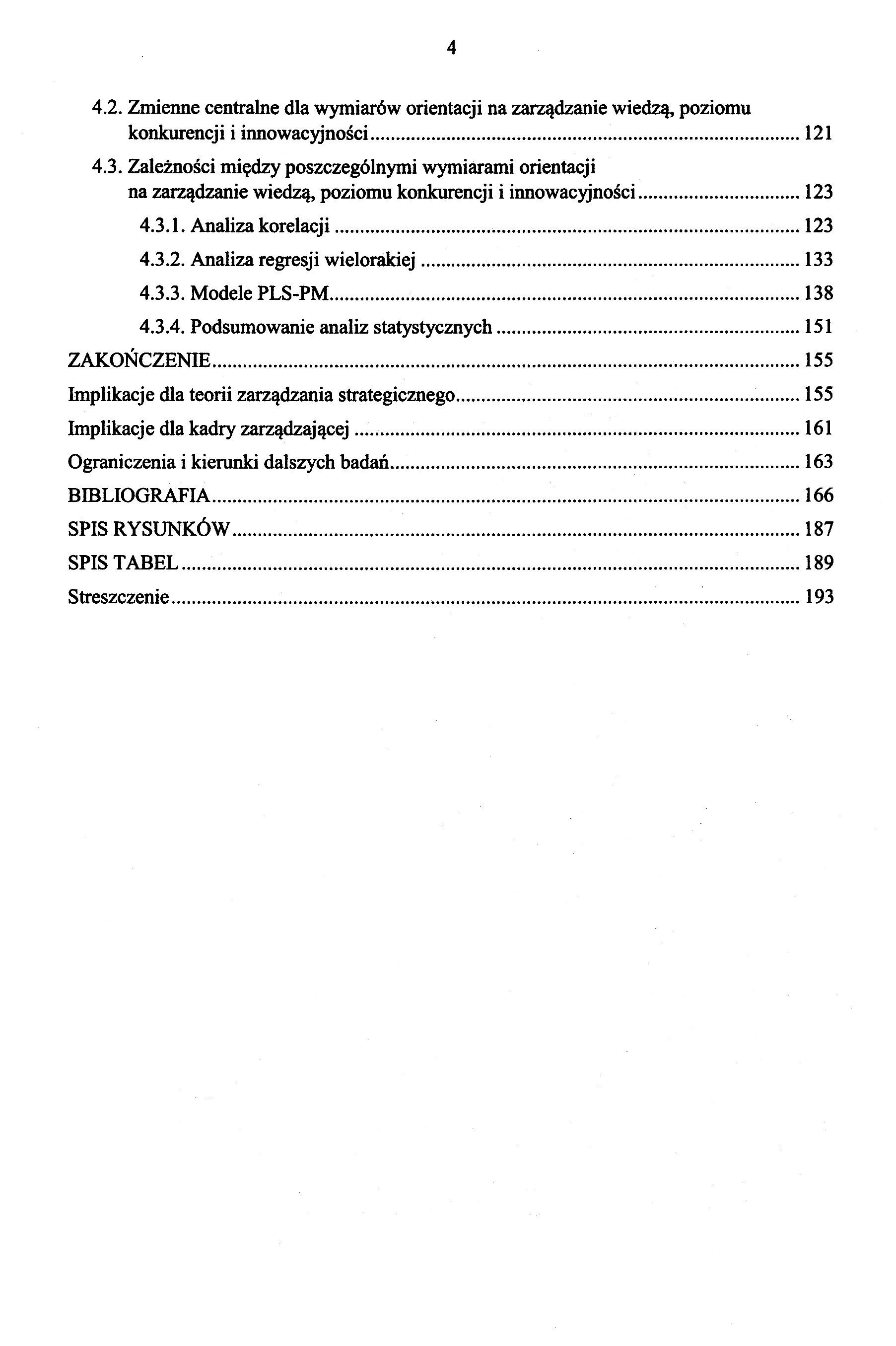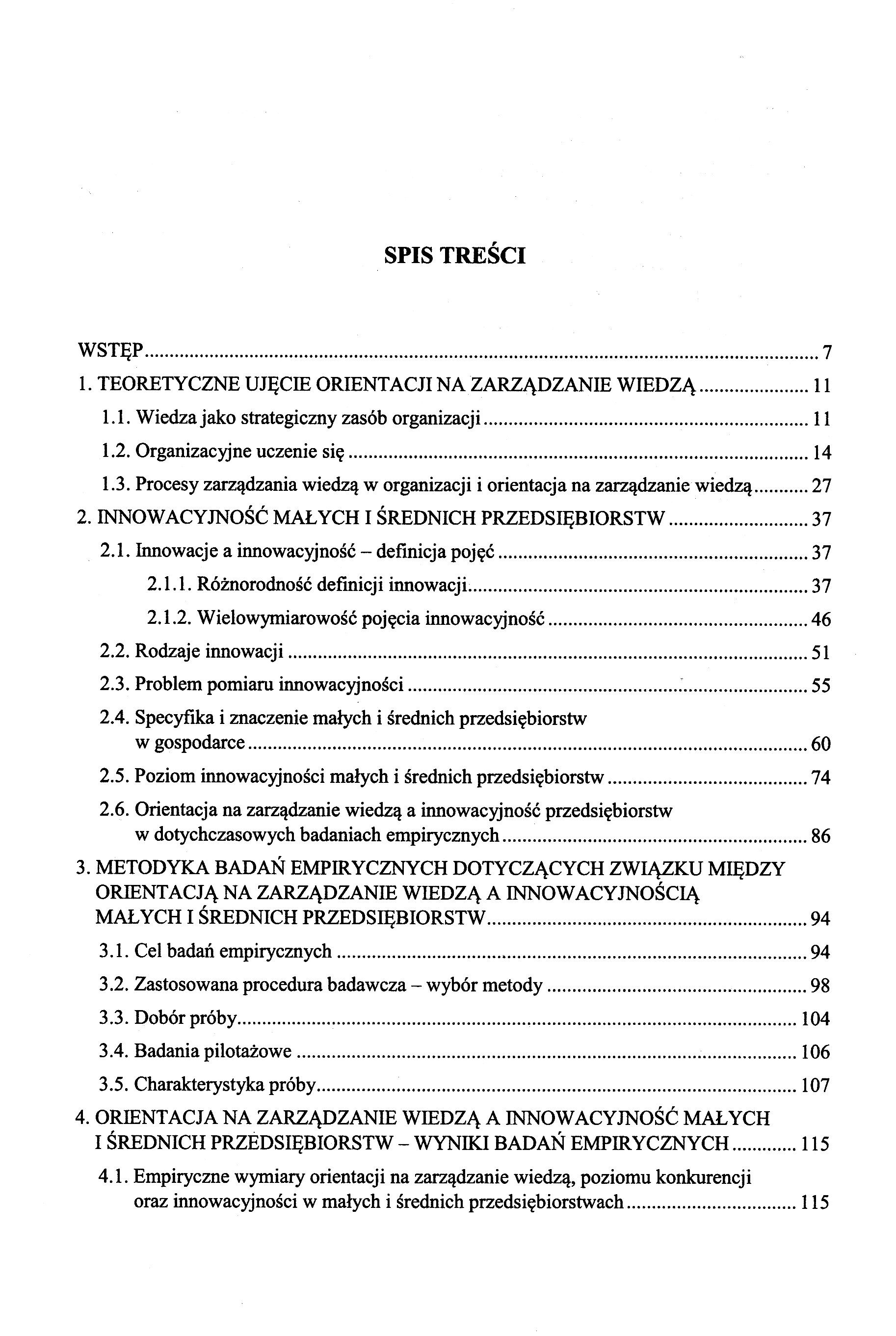1. Teoretyczne ujęcie orientacji na zarządzanie wiedzą 1.1. Wiedza jako strategiczny zasób organizacji 1.2. Organizacyjne uczenie się 1.3. Procesy zarządzania wiedzą w organizacji i orientacja na zarządzanie wiedzą 2. Innowacyjność małych i średnich przedsiębiorstw 2.1. Innowacje a innowacyjność – definicja pojęć 2.1.1. Różnorodność definicji innowacji 2.1.2. Wielowymiarowość pojęcia innowacyjność 2.2. Rodzaje innowacji 2.3. Problem pomiaru innowacyjności 2.4. Specyfika i znaczenie małych i średnich przedsiębiorstw w gospodarce 2.5. Poziom innowacyjności małych i średnich przedsiębiorstw 2.6. Orientacja na zarządzanie wiedzą a innowacyjność przedsiębiorstw w dotychczasowych badaniach empirycznych 3. Metodyka badań empirycznych dotyczących związku między orientacją na zarządzanie wiedzą a innowacyjnością małych i średnich przedsiębiorstw 3.1. Cel badań empirycznych 3.2. Zastosowana procedura badawcza – wybór metody 3.3. Dobór próby 3.4. Badania pilotażowe 3.5. Charakterystyka próby 4. Orientacja na zarządzanie wiedzą a innowacyjność małych i średnich przedsiębiorstw – wyniki badań empirycznych 4.1. Empiryczne wymiary orientacji na zarządzanie wiedzą, poziomu konkurencji oraz innowacyjności w małych i średnich przedsiębiorstwach 4.2. Zmienne centralne dla wymiarów orientacji na zarządzanie wiedzą, poziomu konkurencji i innowacyjności 4.3. Zależności między poszczególnymi wymiarami orientacji na zarządzanie wiedzą, poziomu konkurencji i innowacyjności 4.3.1. Analiza korelacji 4.3.2. Analiza regresji wielorakiej 4.3.3. Modele PLS-PM 4.3.4. Podsumowanie analiz statystycznych.